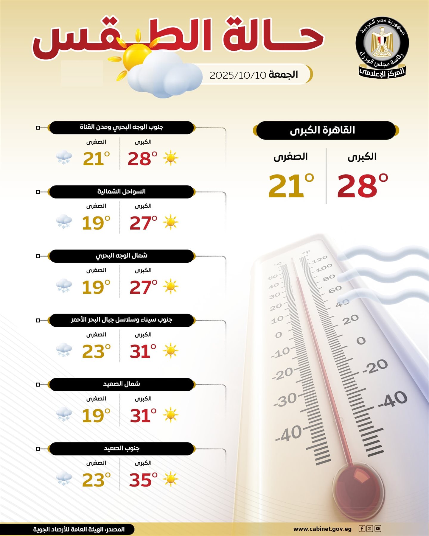 ويتوقع خبراء هيئة الأرصاد الجوية أن يسود اليوم الجمعة 10 أكتوبر 2025 طقس مائل للحرارة نهارًا على القاهرة الكبرى والوجه البحري والسواحل الشمالية حار على جنوب سيناء وجنوب البلاد، وطقس معتدل ليلا على أغلب الأنحاء.