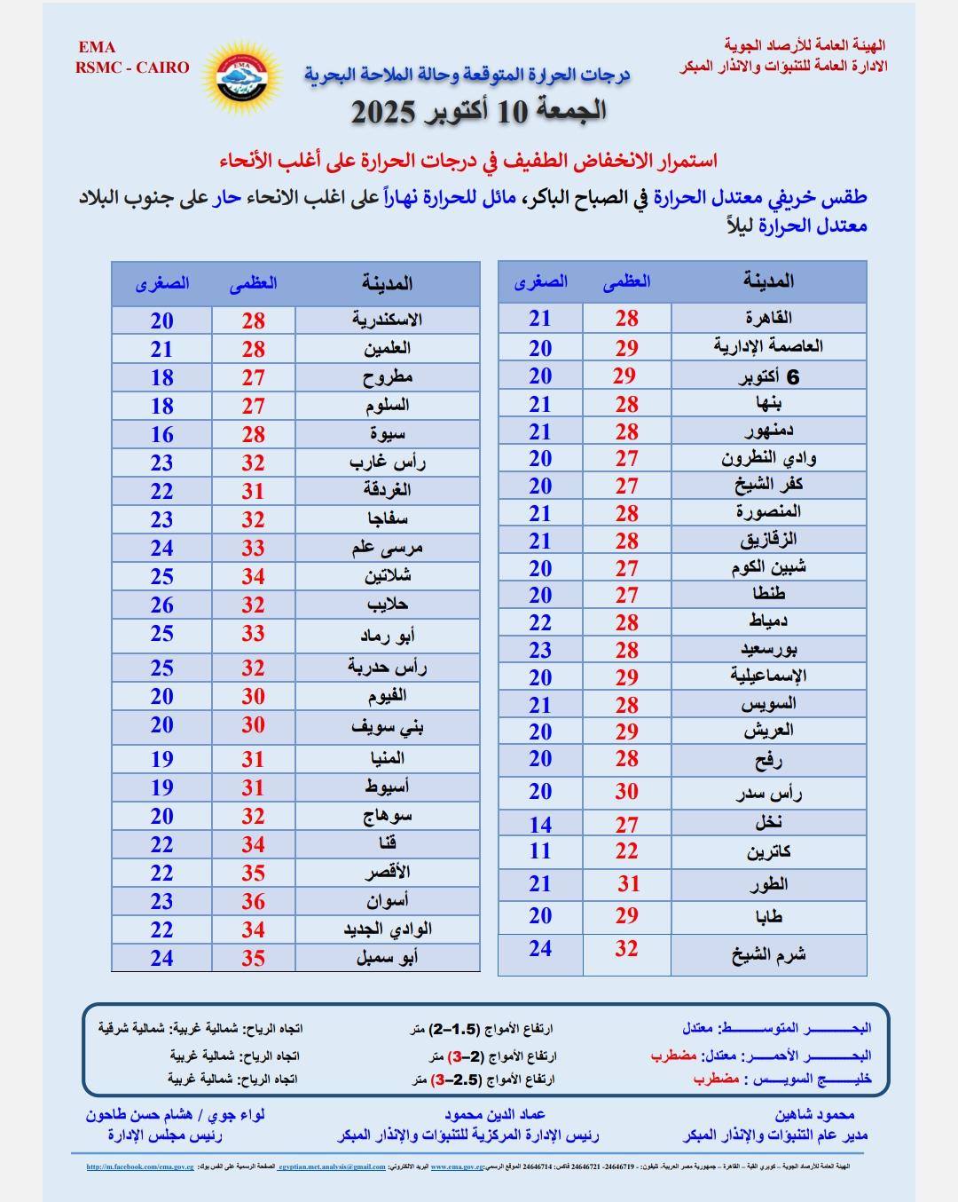 وفيما يلي بيان بدرجات الحرارة، اليوم، على محافظات ومدن مصر: