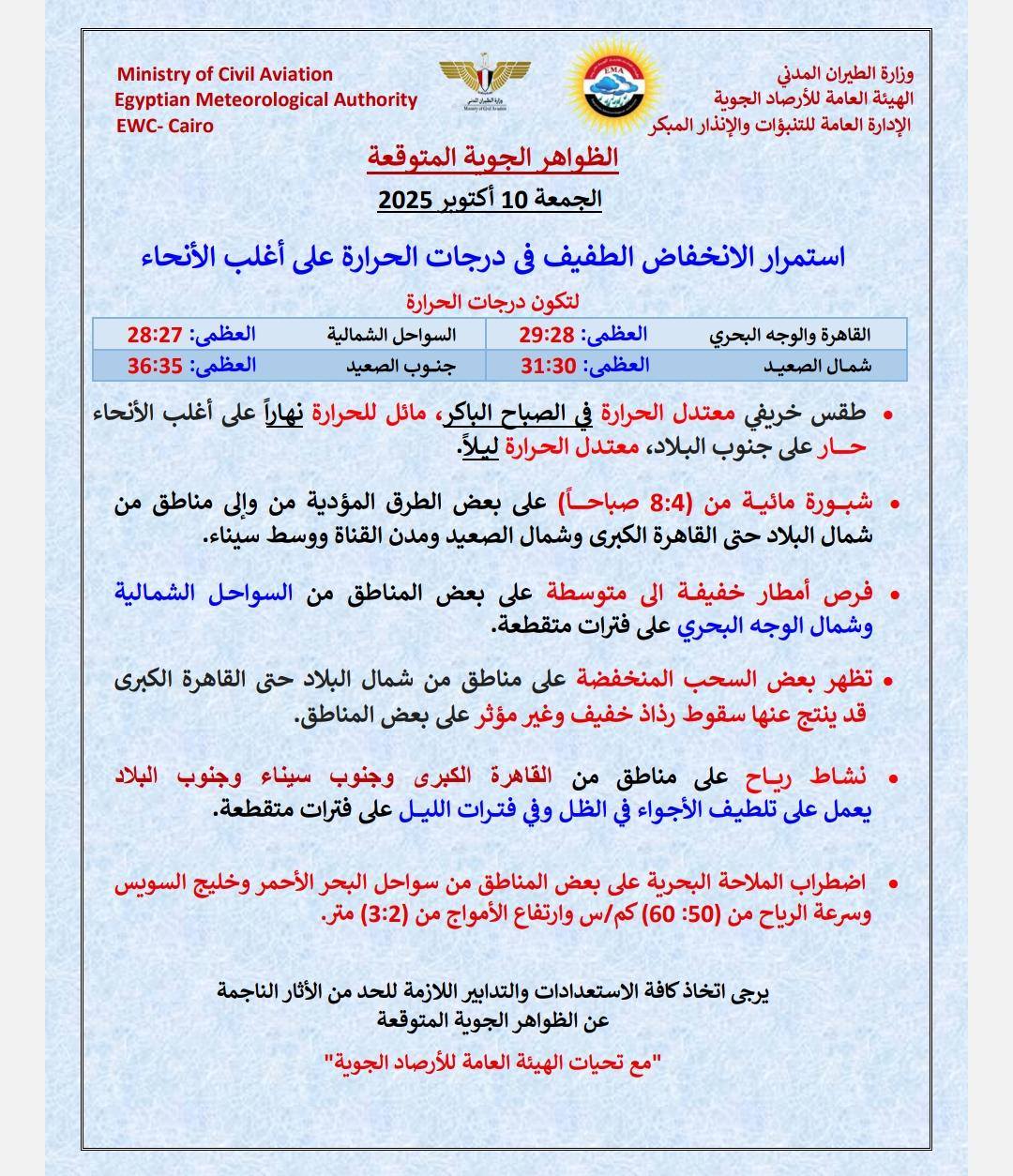 ويسود، اليوم، طقس مائل للحرارة نهارًا على القاهرة الكبرى والوجه البحري والسواحل الشمالية، حار على جنوب سيناء وجنوب البلاد، وطقس معتدل ليلًا على أغلب الأنحاء، بينما تنشط رياح على مناطق من القاهرة الكبرى وجنوب سيناء وجنوب البلاد على فترات متقطعة.