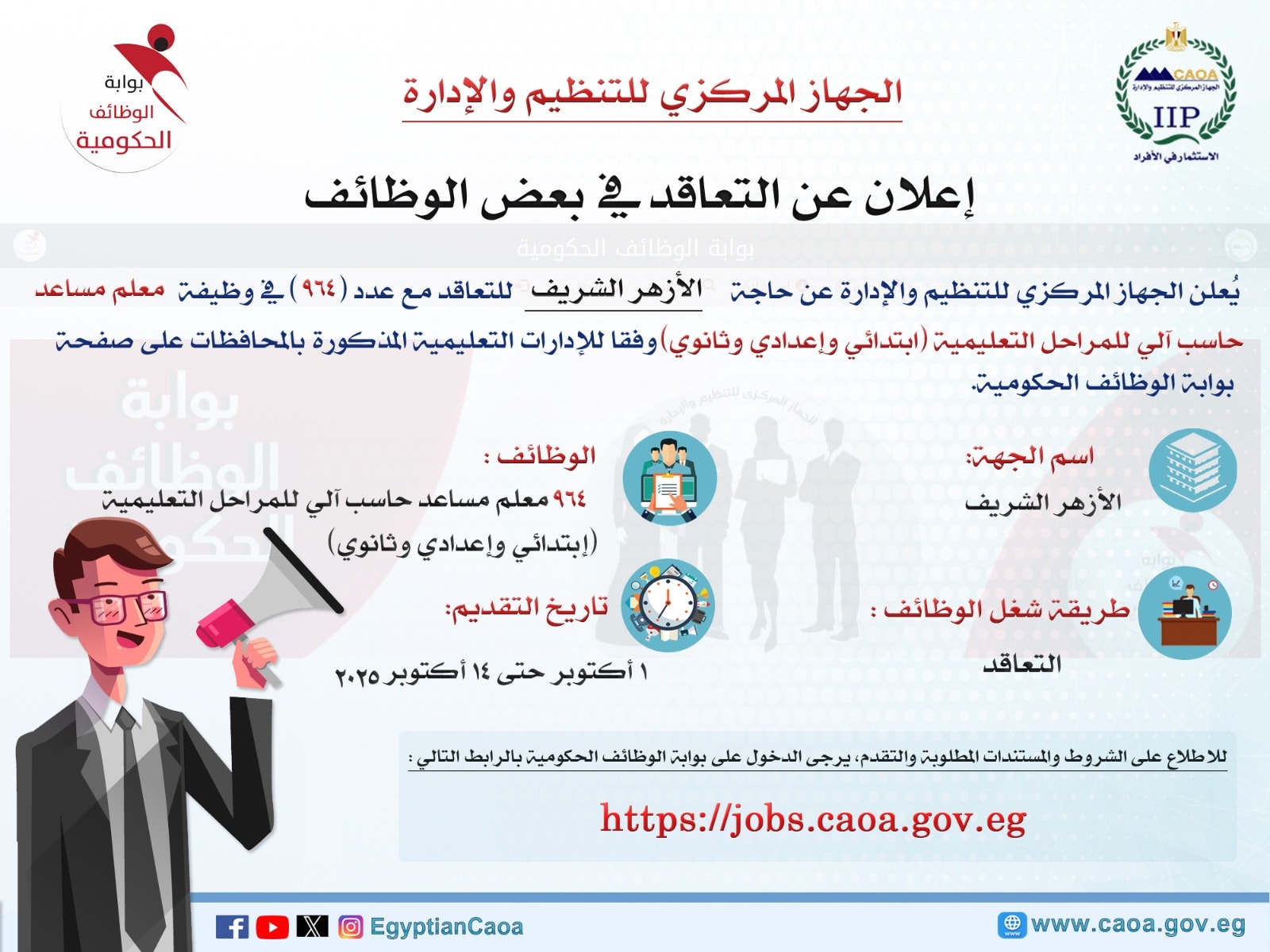 وأوضح الجهاز المركزي أن آخر موعد للتقديم على وظائف معلم مساعد حاسب آلي بالأزهر يوم 2025-10-14، حيثت تتوافر 964 وظيفة في الإدارات التعلمية الآتية: «جنوب سيناء، شمال سيناء، مطروح، الوادي الجديد، البحر الأحمر، الأقصر، أسوان، قنا، سوهاج، أسيوط، المنيا، الفيوم، بني سويف، الجيزة، الاسماعيلية، البحيرة، المنوفية، الغربية، كفر الشيخ، القليوبية، الشرقية، الدقهلية، دمياط، السويس، بورسعيد، الإسكندرية، القاهرة».