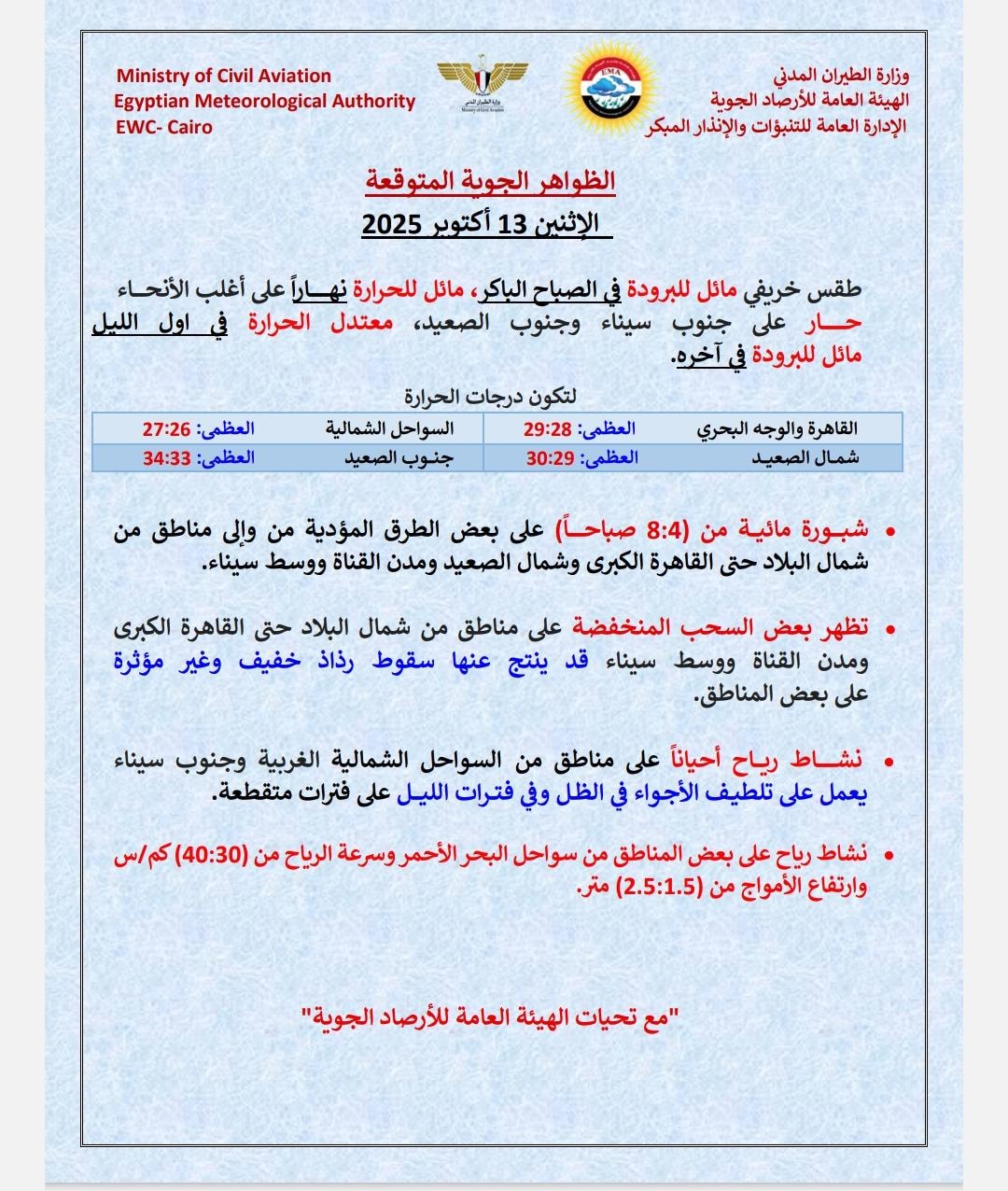 يتوقع خبراء الهيئة العامة للأرصاد الجوية، أن يشهد غدًا الإثنين 13- 10- 2025، طقس خريفي مائل للبرودة في الصباح الباكر، مائل للحرارة نهارًا على أغلب الأنحاء حار على جنوب سيناء وجنوب الصعيد، معتدل الحرارة في أول الليل مائل للبرودة في آخره.