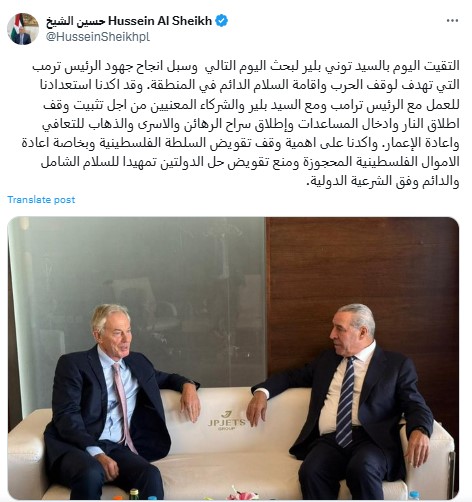 ونشر الشيخ في تدوينة عبر حسابه على موقع اكس، قائلا: "التقيت اليوم بتوني بلير لبحث اليوم التالي، وسبل إنجاح جهود الرئيس ترامب التي تهدف لوقف الحرب وإقامة السلام الدائم في المنطقة.