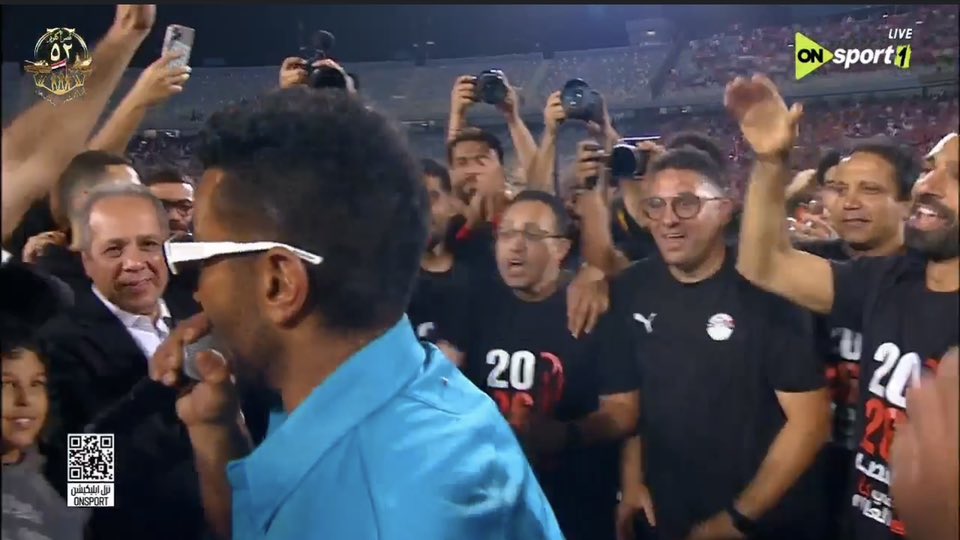 احتفل النجمان حمادة هلال وأحمد سعد مع لاعبو منتخب مصر بالتأهل إلى كاس العالم 2026 وسط حضور جماهير كبير، على هامش لقاء مصر وغينيا بيساو في الجولة الختامية للتصفيات الإفريقية المؤهلة للمونديال.