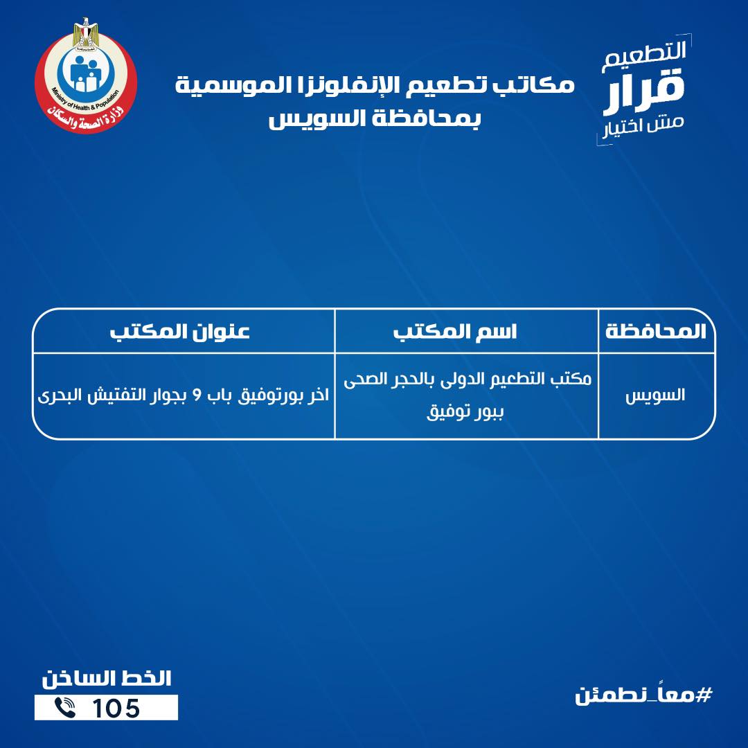 أعلنت وزارة الصحة والسكان عبر صفحتها الرسمية عناوين مكاتب التطعيم ضد الإنفلونزا الموسمية على مستوى الجمهورية، مؤكدة أن اللقاحات آمنة وفعالة وتعد من أهم الوسائل الوقائية لتقليل فرص الإصابة وتفادي مضاعفات المرض خاصة مع اقتراب فصل الشتاء.