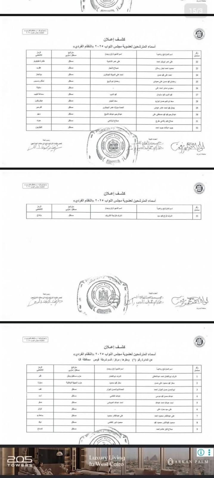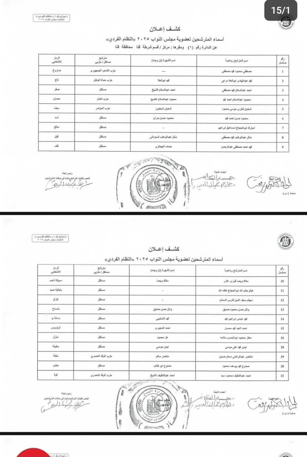 وتضمن الكشفان أسماء المترشحين والصفة التي ثبتت لكل منهم، وحدد الكشف الثاني اسم القائمة التي ينتمي إليها المترشح، على أن يستمر عرض الكشفين على مدار أيام 16 و17 و18 أكتوبر، وتنشرهما الهيئة الوطنية للانتخابات في جريدتي الأخبار والجمهورية.