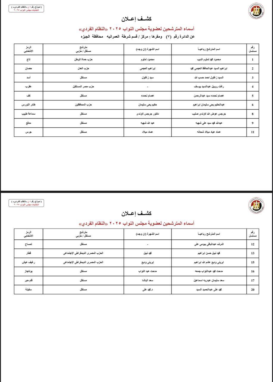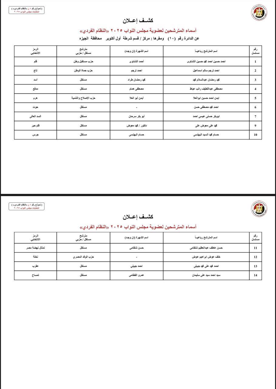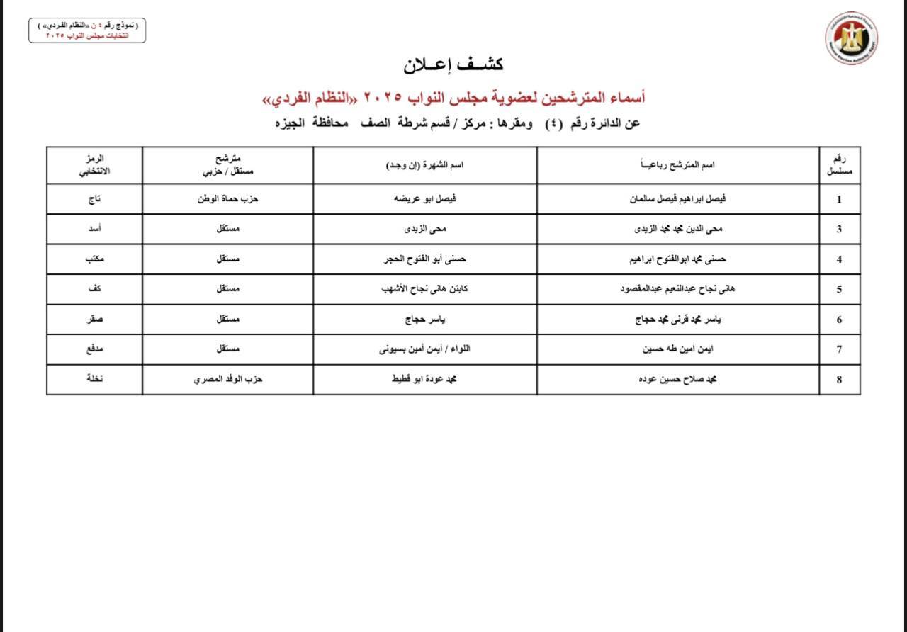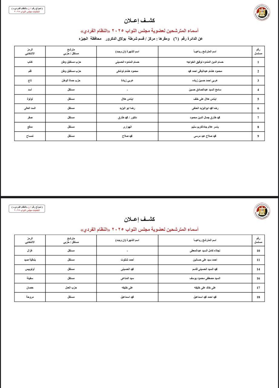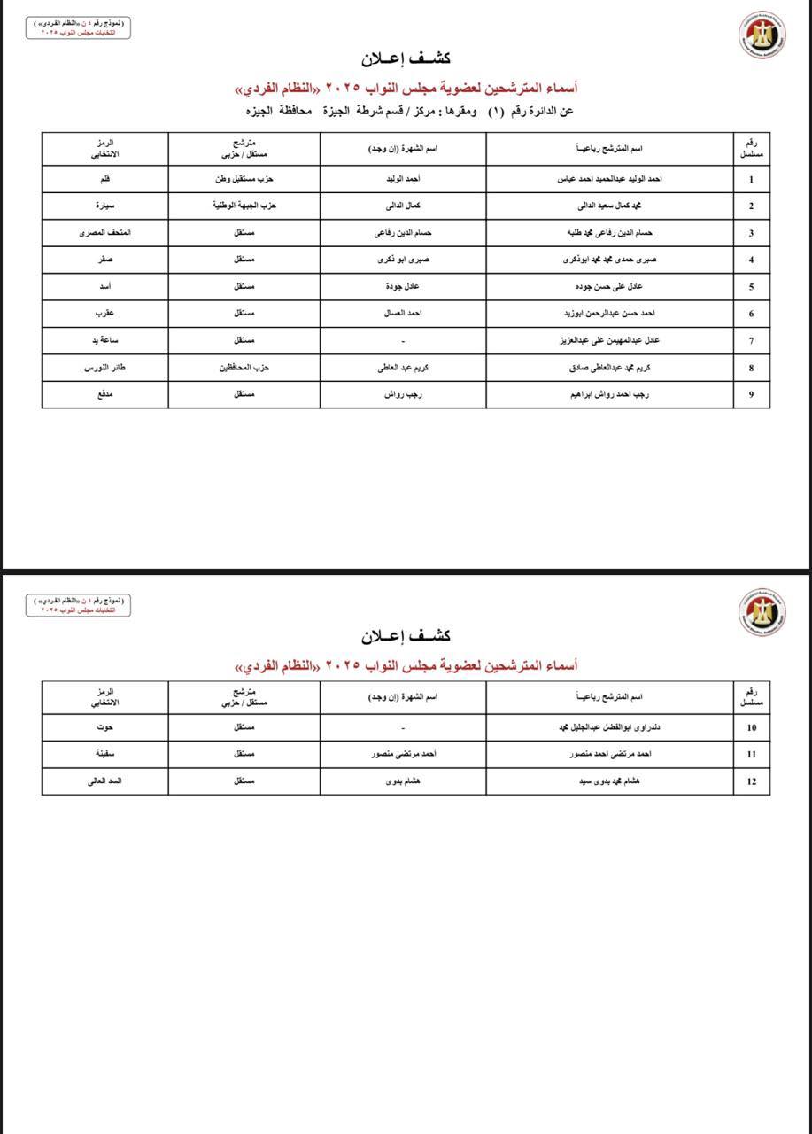 ننشر أسماء المرشحين على مقاعد الفردي في انتخابات مجلس النواب 2025 بدوائر محافظة الجيزة