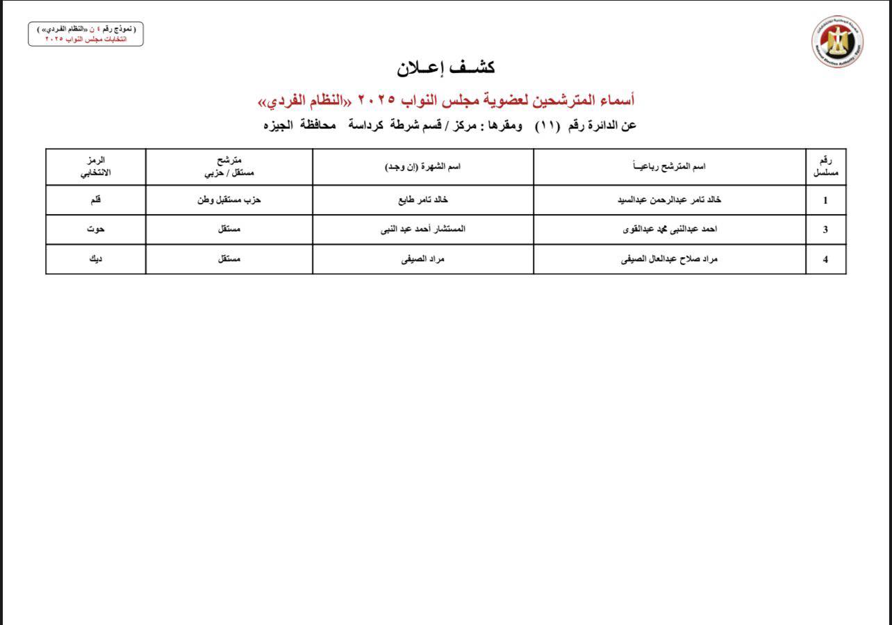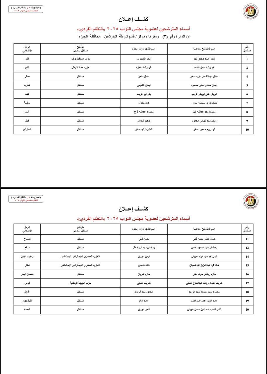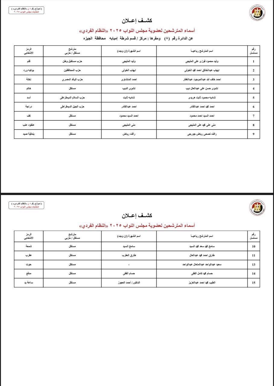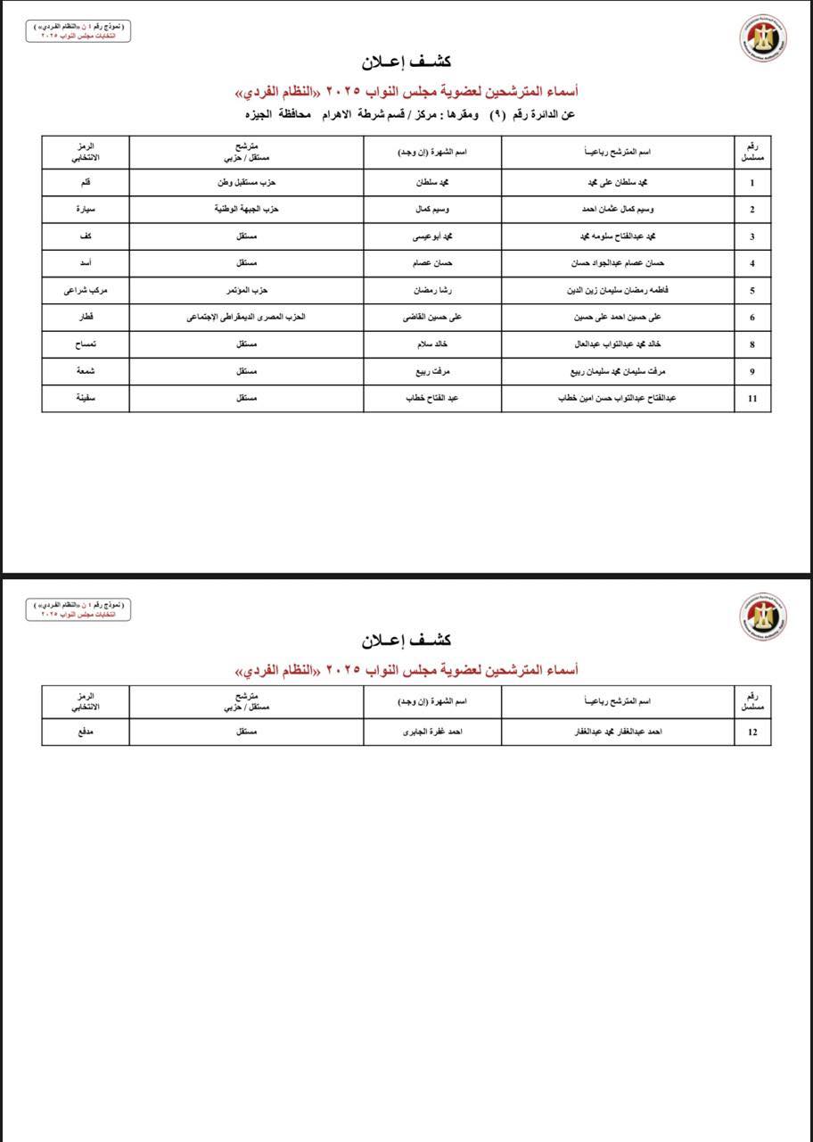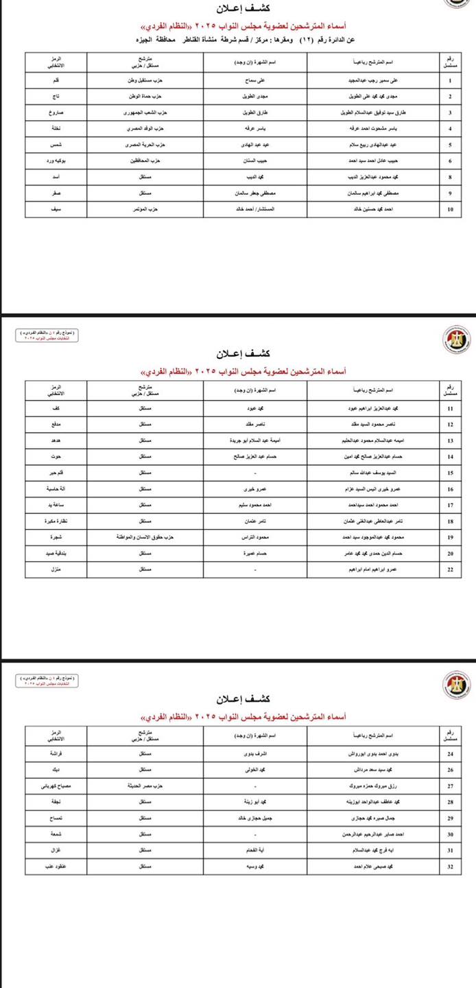 ننشر أسماء المرشحين على مقاعد الفردي في انتخابات مجلس النواب 2025 بدوائر محافظة الجيزة