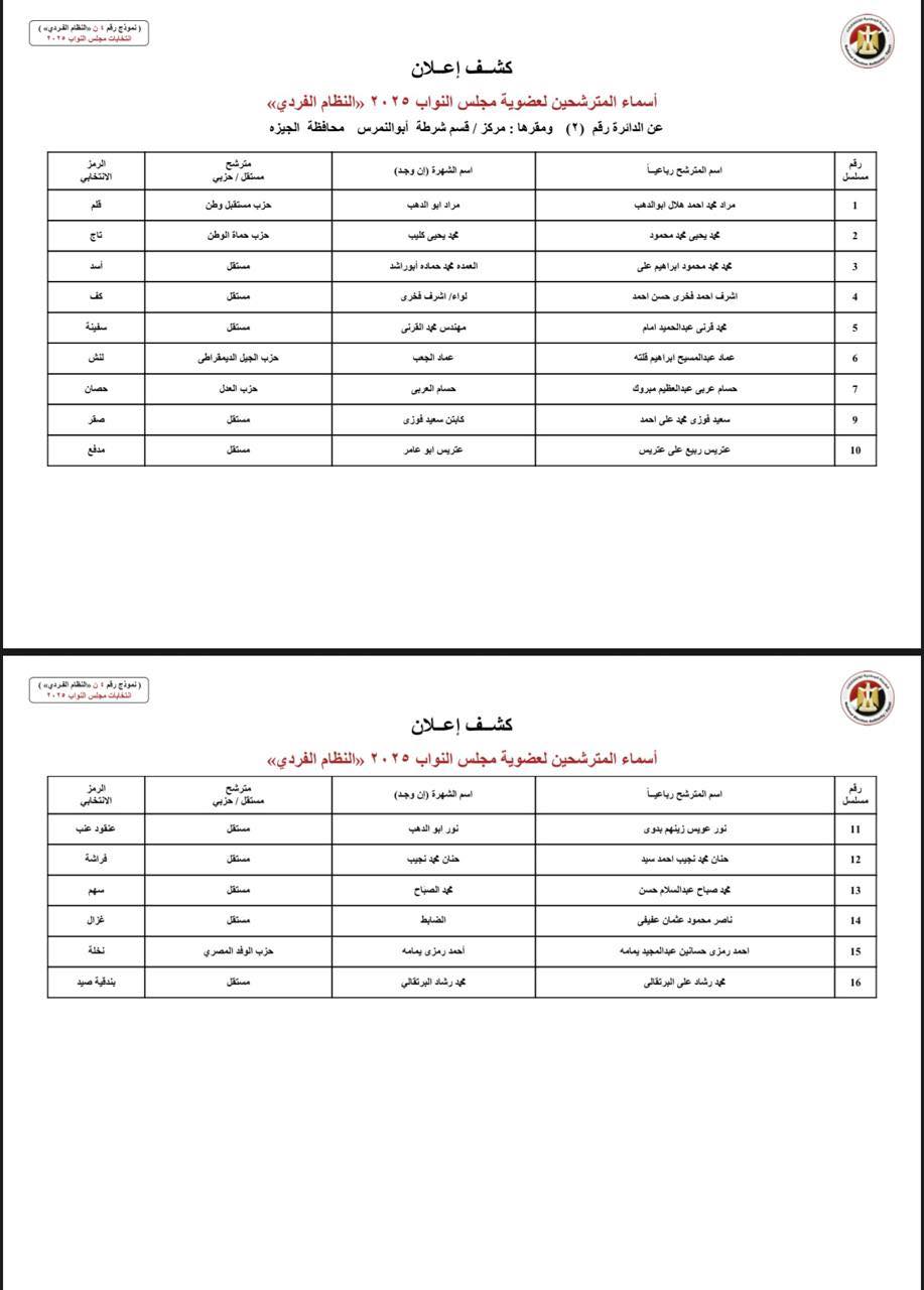 وتضمنت كشوف الهيئة الوطنية للانتخابات أسماء المرشحين ودوائرهم ورموزهم على النظام الفردي وذلك على النحو التالي: