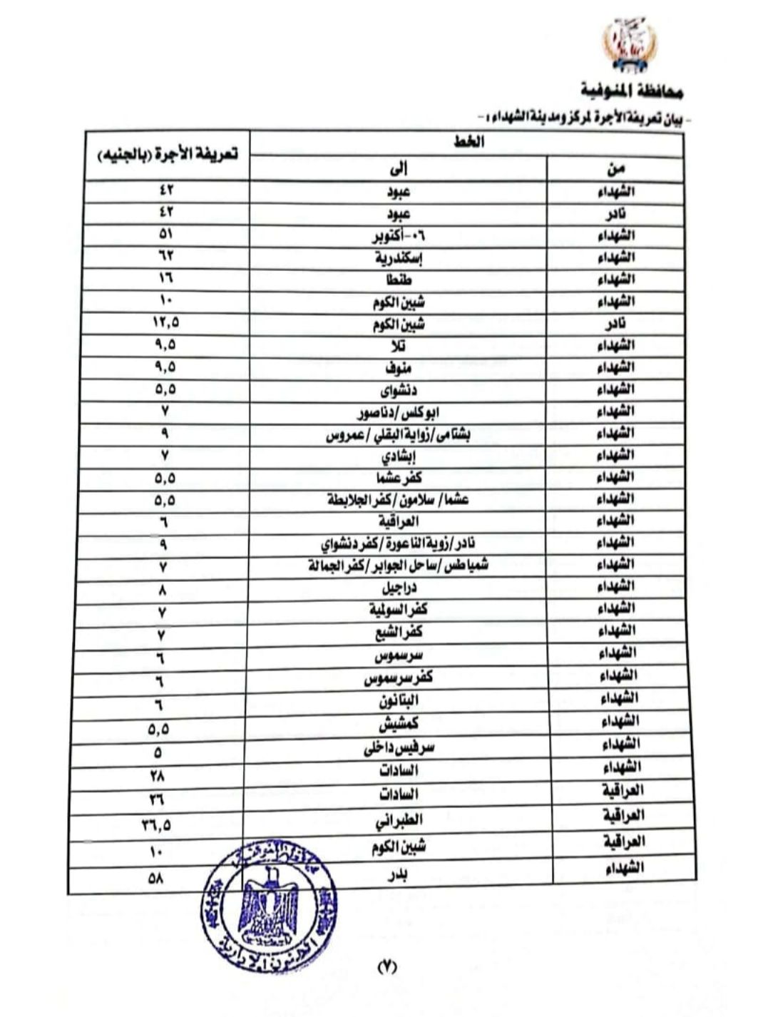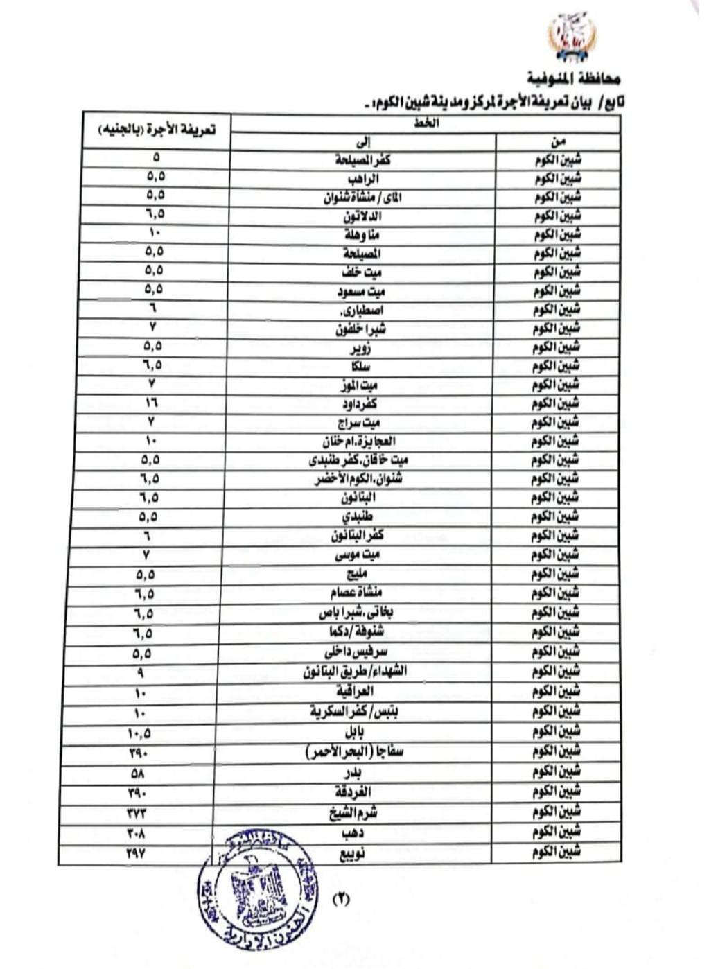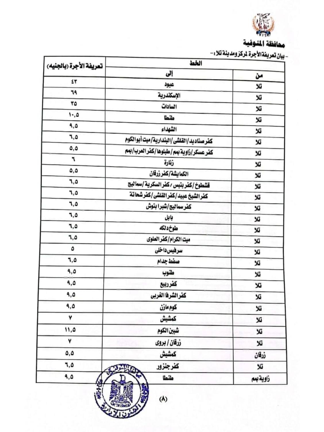 أسعار تعريفة الركوب الجديدة لسيارات الأجرة والتاكسي بالخطوط الداخلية والخارجية بمحافظة المنوفية