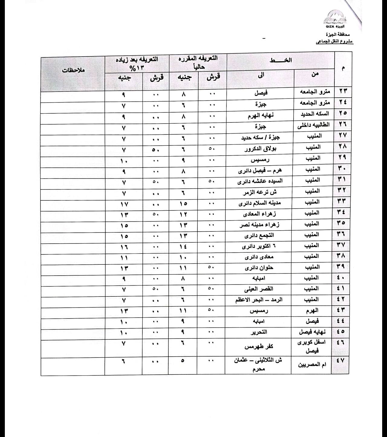 اعتمد المهندس عادل النجار، محافظ الجيزة، التعريفة الجديدة لسيارات السرفيس والنقل الجماعي الداخلية والخارجية، التي يتم تطبيقها اعتبارًا من اليوم الجمعة، بعد رفع أسعار البنزين والسولار.