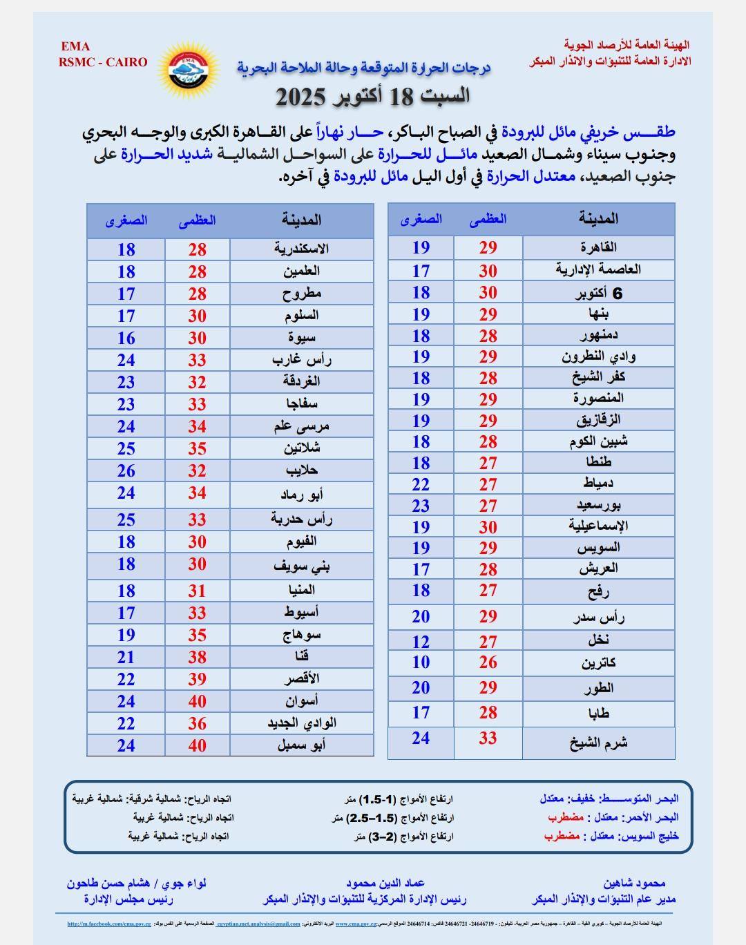 وفيما يلي بيان بدرجات الحرارة المتوقعة، غدًا، على محافظات ومدن مصر: