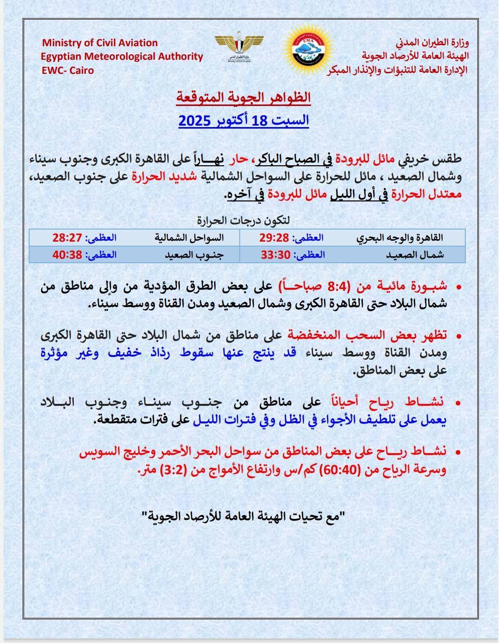 وعن الظواهر الجوية، وتسود شبورة مائية صباحًا على شمال البلاد حتى القاهرة الكبرى وشمال الصعيد على بعض الطرق الزراعية والسريعة والقريبة من المسطحات المائية، وتنشط رياح على مناطق من جنوب سيناء وجنوب البلاد على فترات متقطعة.