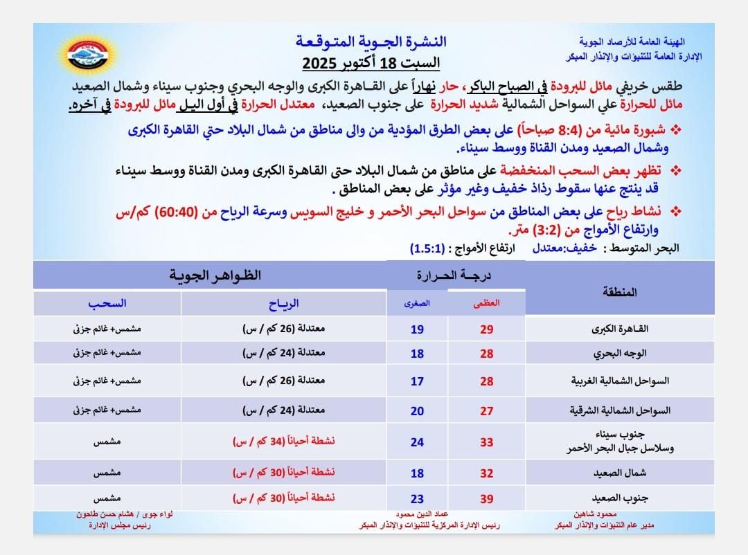 كما توقعت أن يسود طقس حار نهارًا على القاهرة الكبرى وعلى الوجه البحري وشمال الصعيد وسيناء، مائل للحرارة على السواحل الشمالية وشديد الحرارة على جنوب الصعيد.