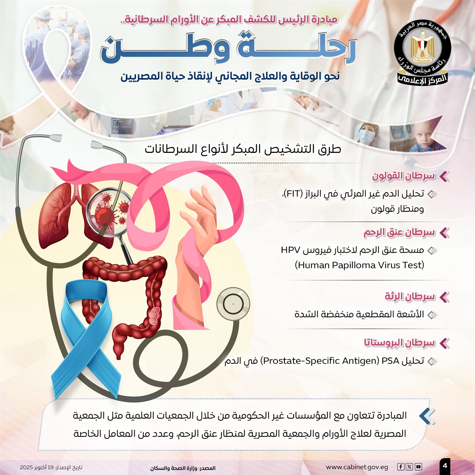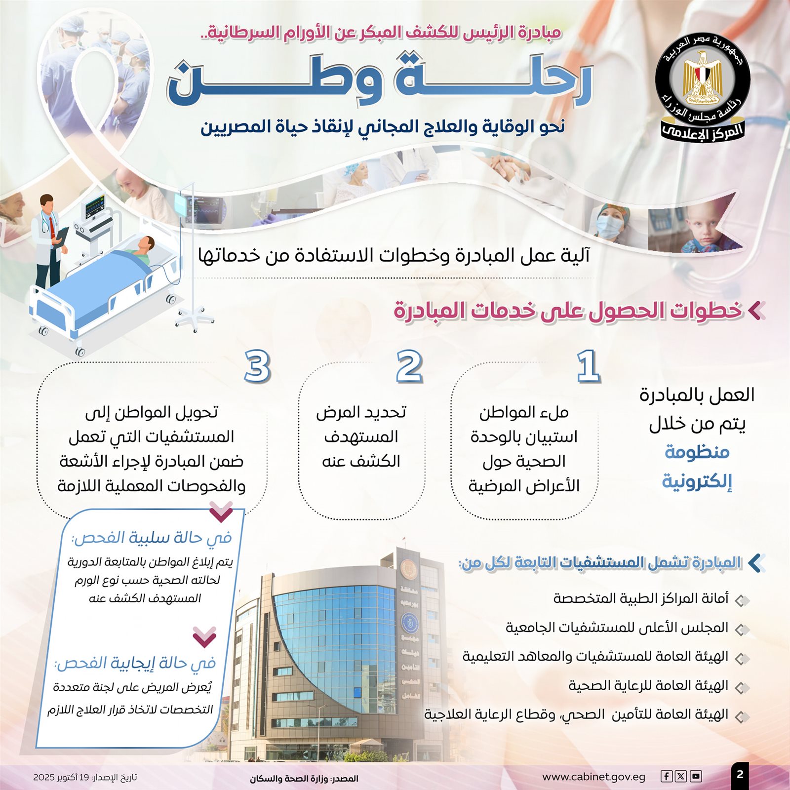 نشر المركز الإعلامي لمجلس الوزراء عددًا من الإنفوجرافات عبر منصاته على مواقع التواصل الاجتماعي، سلط من خلالها الضوء على جهود الدولة في مكافحة الأورام السرطانية من خلال المبادرة الرئاسية للكشف المبكر عن الأورام.