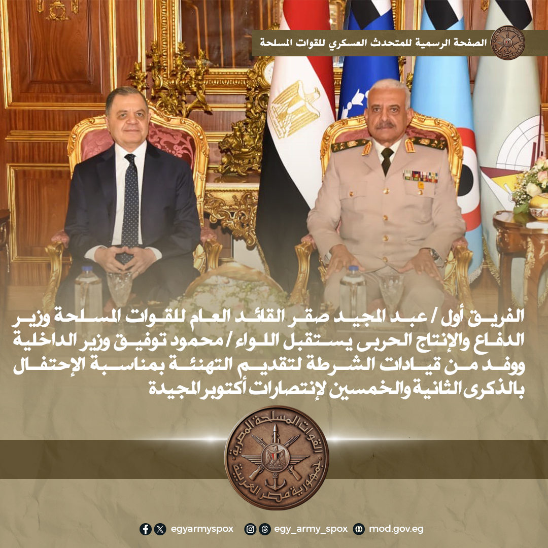 استقبل الفريق أول عبدالمجيد صقر القائد العام للقوات المسلحة وزير الدفاع والإنتاج الحربى اللواء محمود توفيق وزير الداخلية على رأس وفد من قيادات وزارة الداخلية لتقديم التهنئة للقوات المسلحة بمناسبة الاحتفال بالذكرى الثانية والخمسين لانتصارات أكتوبر المجيدة، وذلك بحضور الفريق أحمد خليفة رئيس أركان حرب القوات المسلحة وعدد من قادة القوات المسلحة.