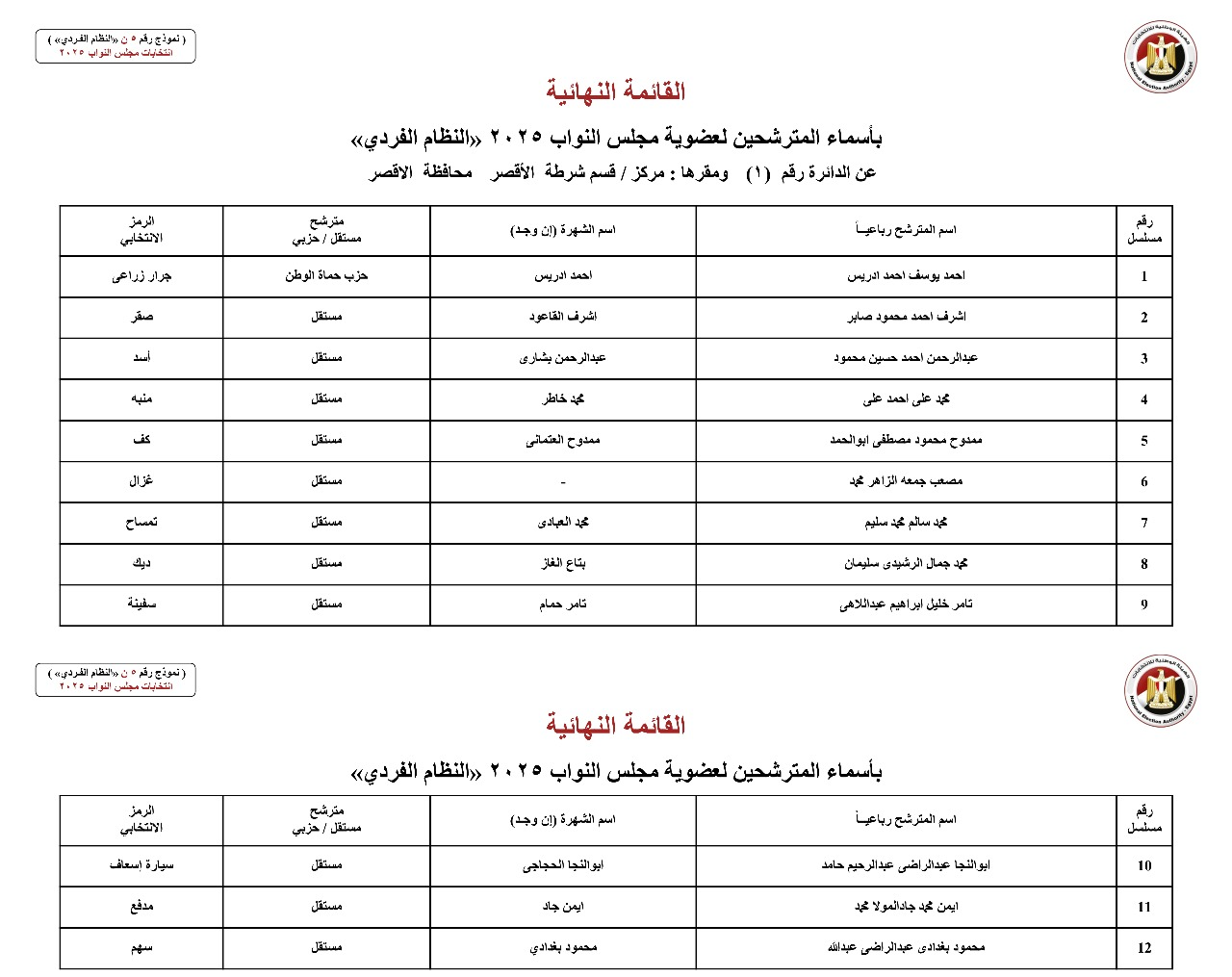 القائمة النهائية لمترشحي دوائر محافظة الأقصر عن النظام الفردي