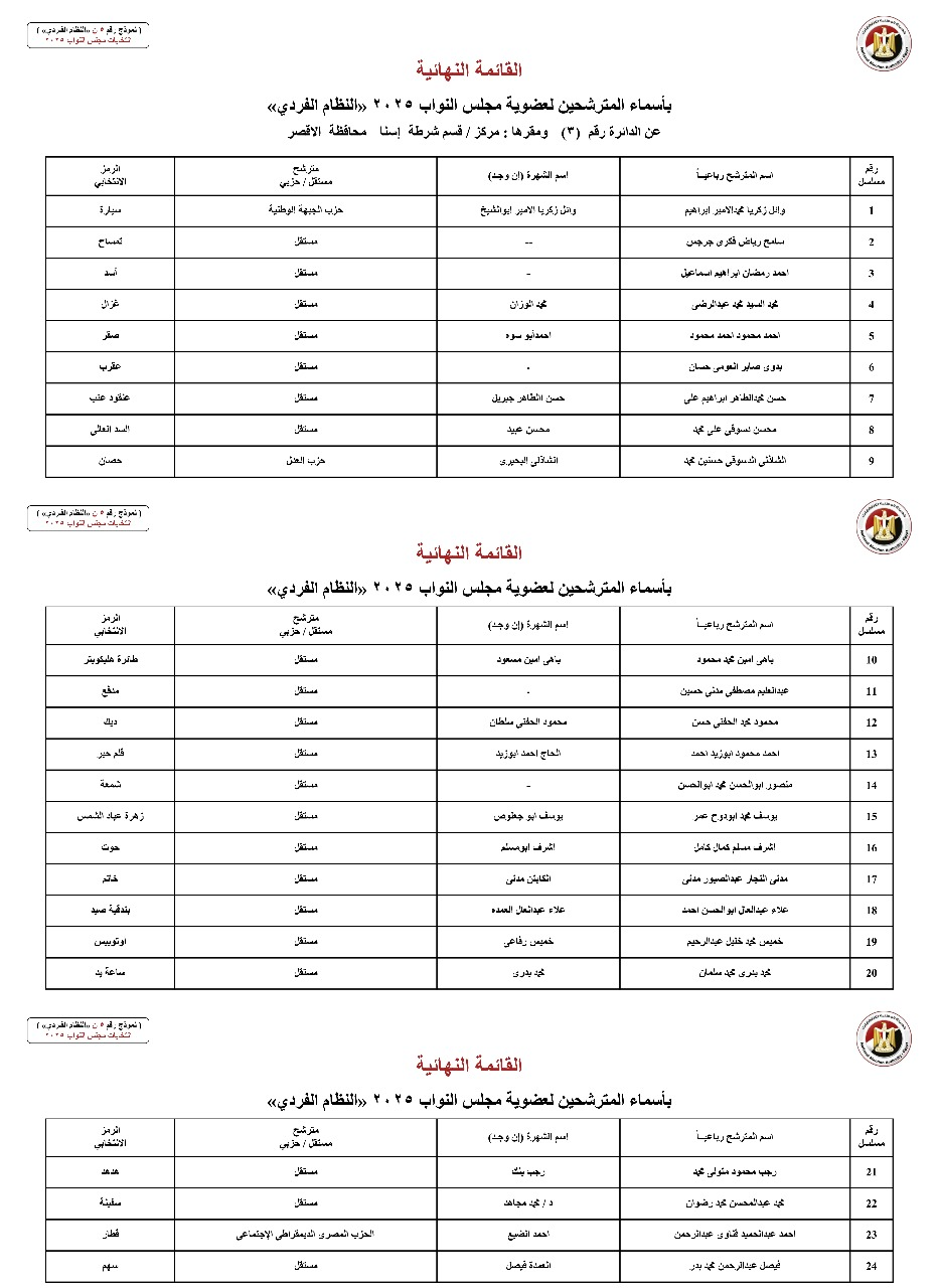 القائمة النهائية لمترشحي دوائر محافظة أسوان عن النظام الفردي