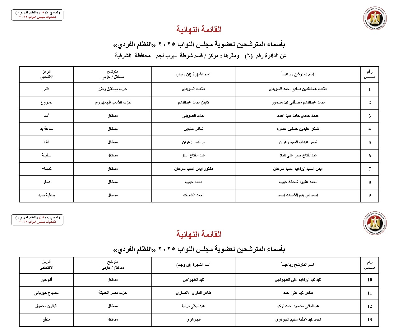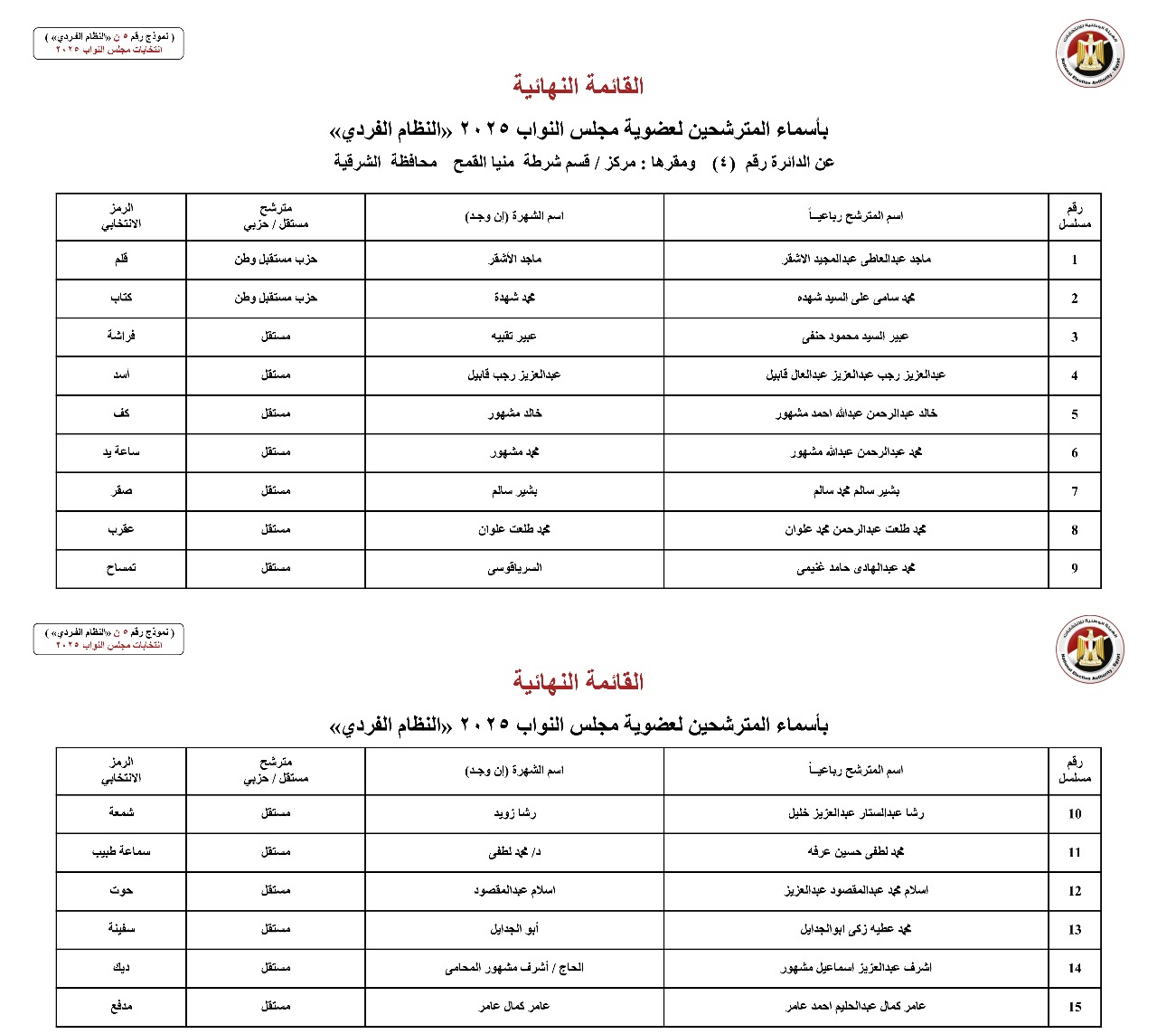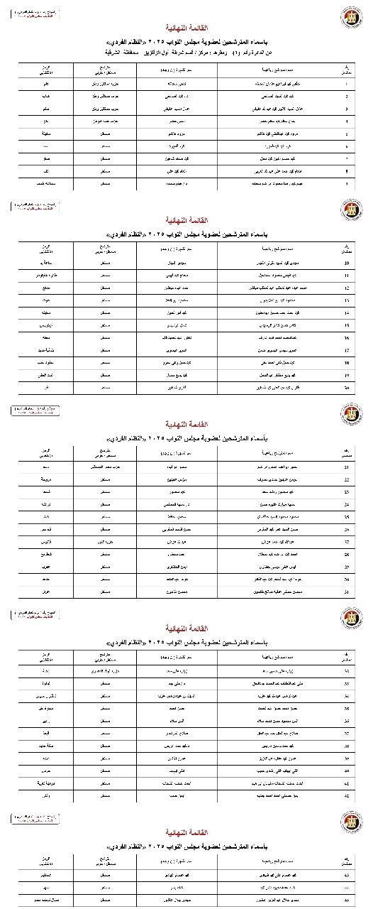 القائمة النهائية لمترشحي دوائر محافظة الشرقية عن النظام الفردي