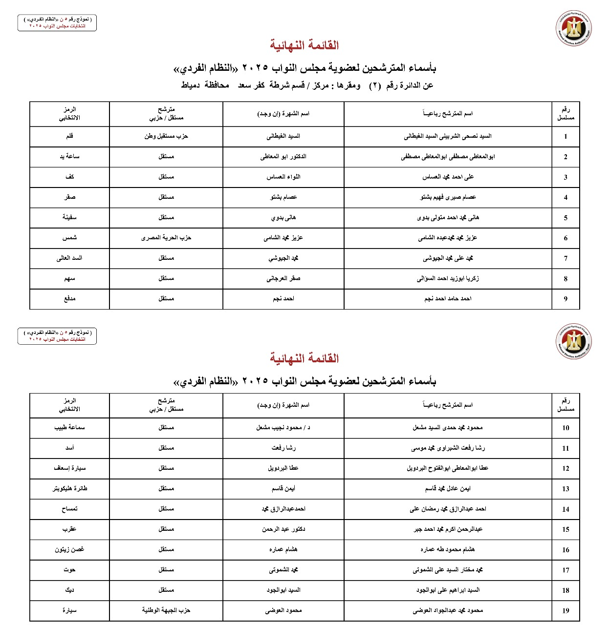 القائمة النهائية لمترشحي دوائر محافظة دمياط عن النظام الفردي