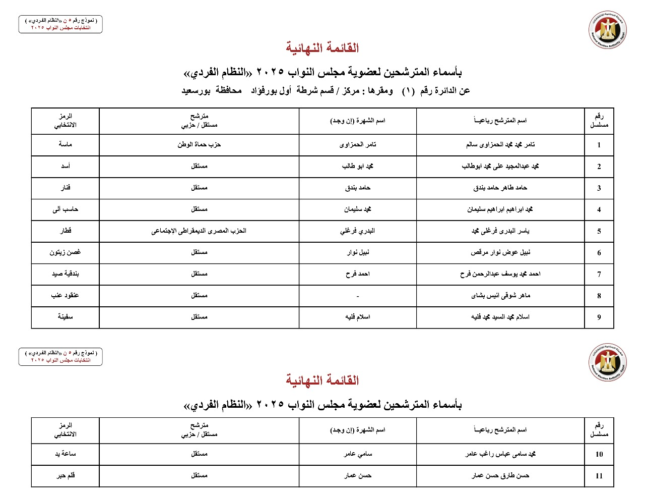 القائمة النهائية لمترشحي دوائر محافظة بورسعيد عن النظام الفردي