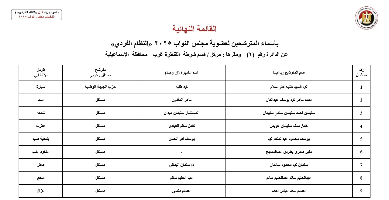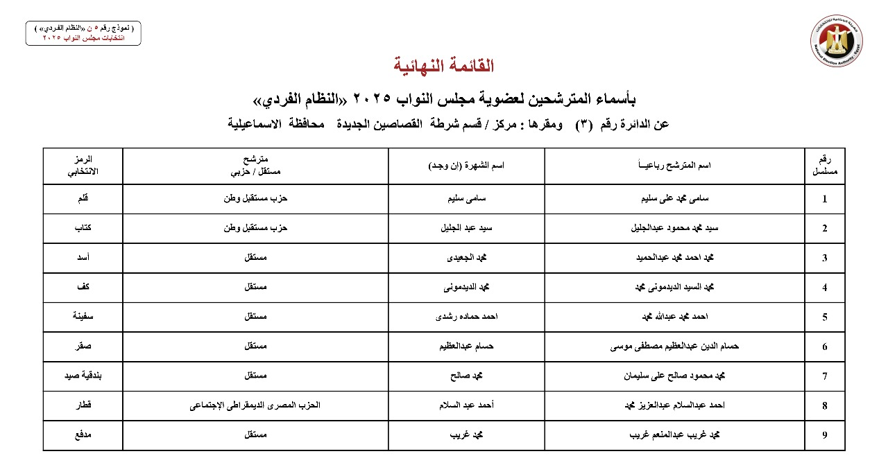 القائمة النهائية لمترشحي دوائر محافظة الإسماعيلية عن النظام الفردي
