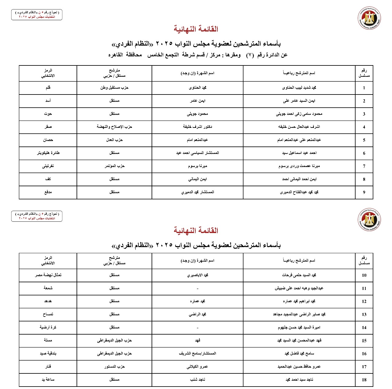 القائمة النهائية لمرشحي دوائر محافظة القاهرة عن النظام الفردي