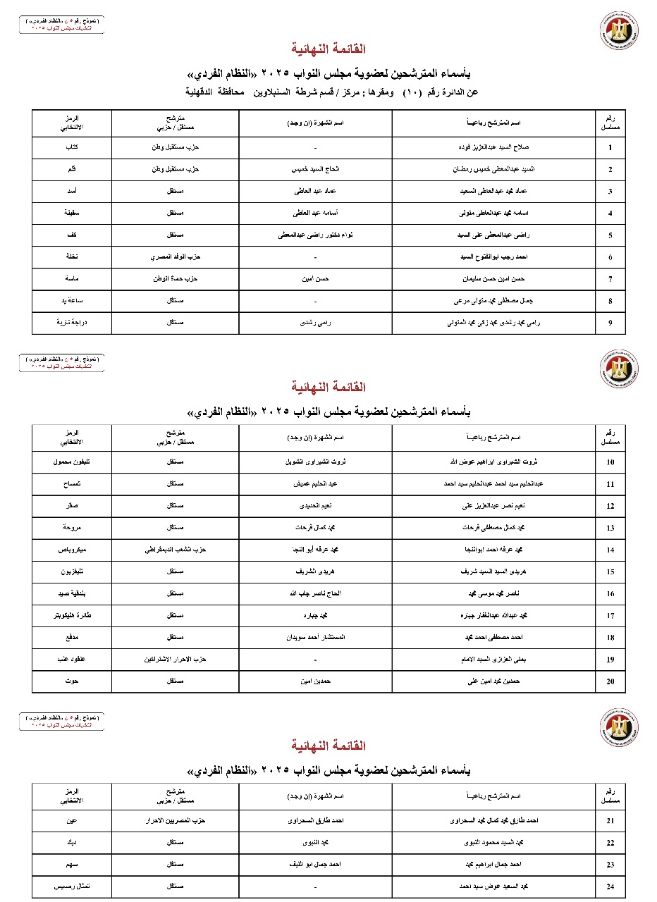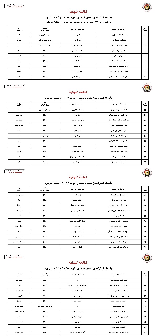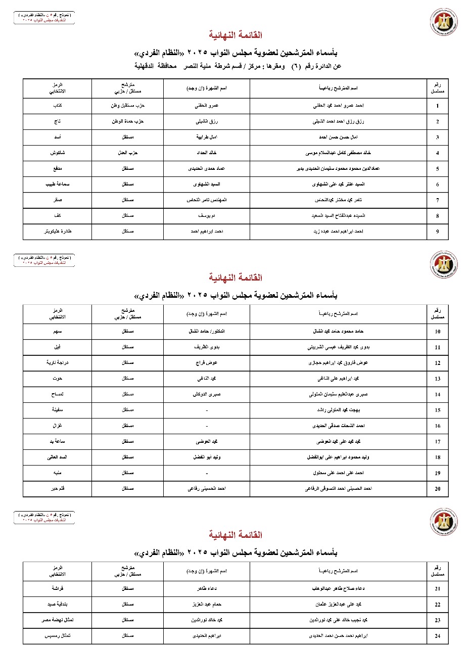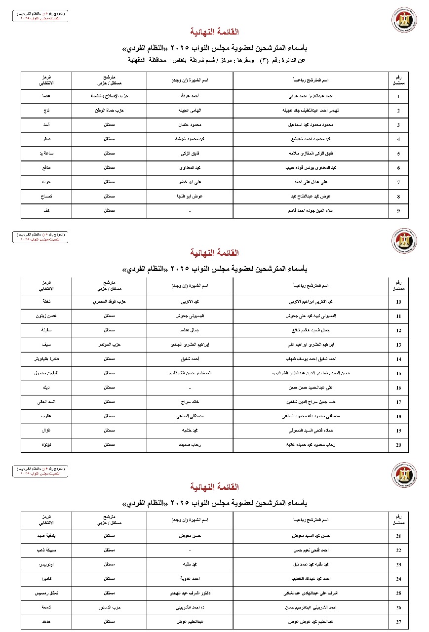 القائمة النهائية لمرشحي دوائر محافظة الدقهلية عن النظام الفردي