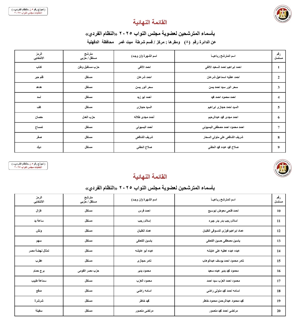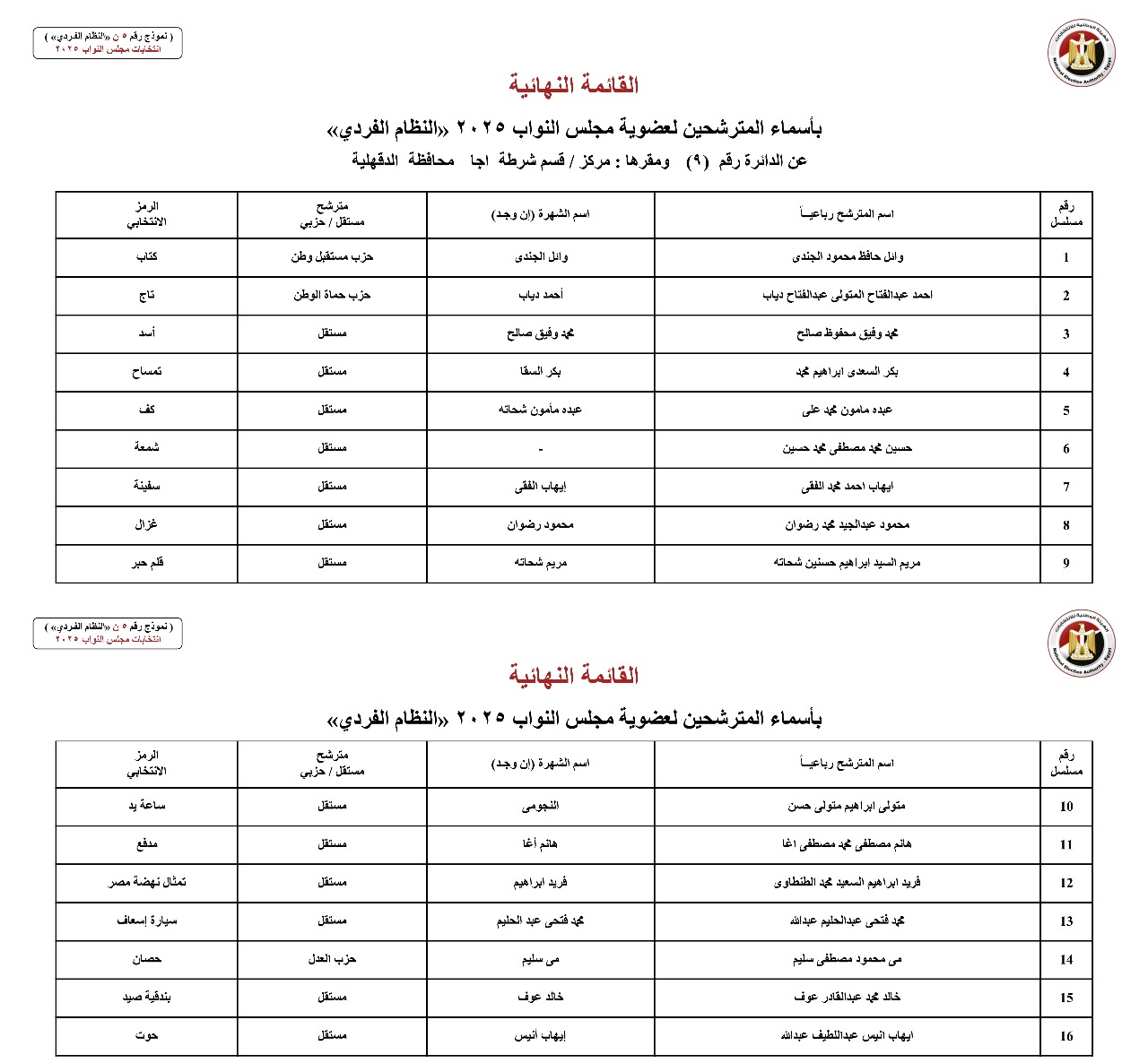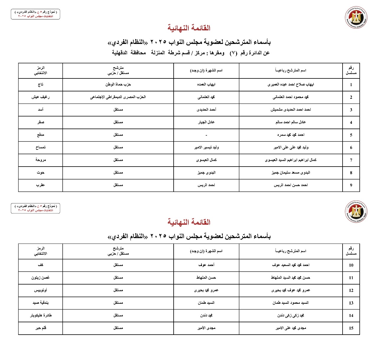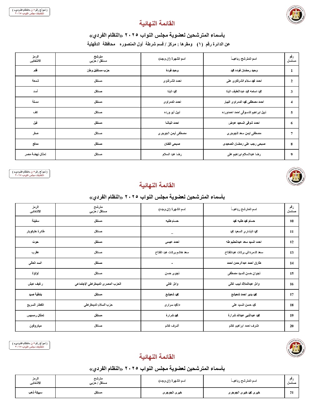 القائمة النهائية لمرشحي دوائر محافظة الدقهلية عن النظام الفردي