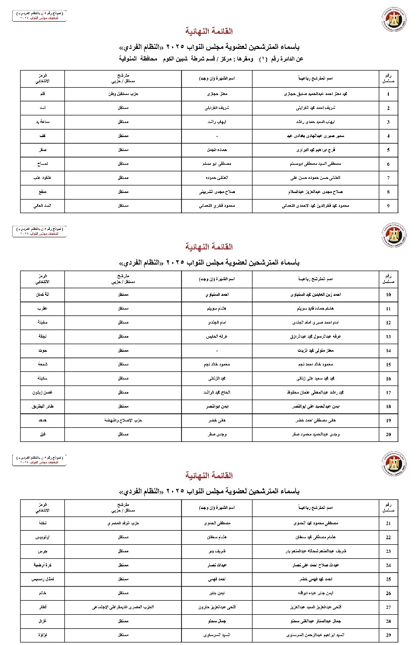 القائمة النهائية لمرشحي دوائر محافظة المنوفية عن النظام الفردي