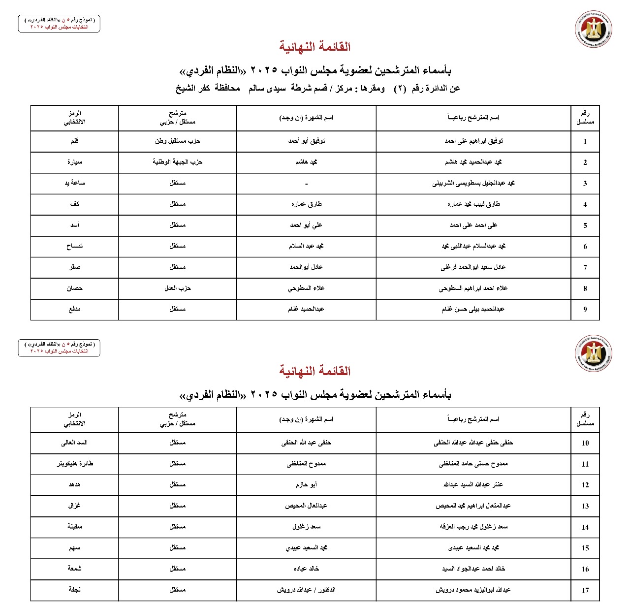 القائمة النهائية لمرشحي دوائر محافظة كفر الشيخ عن النظام الفردي