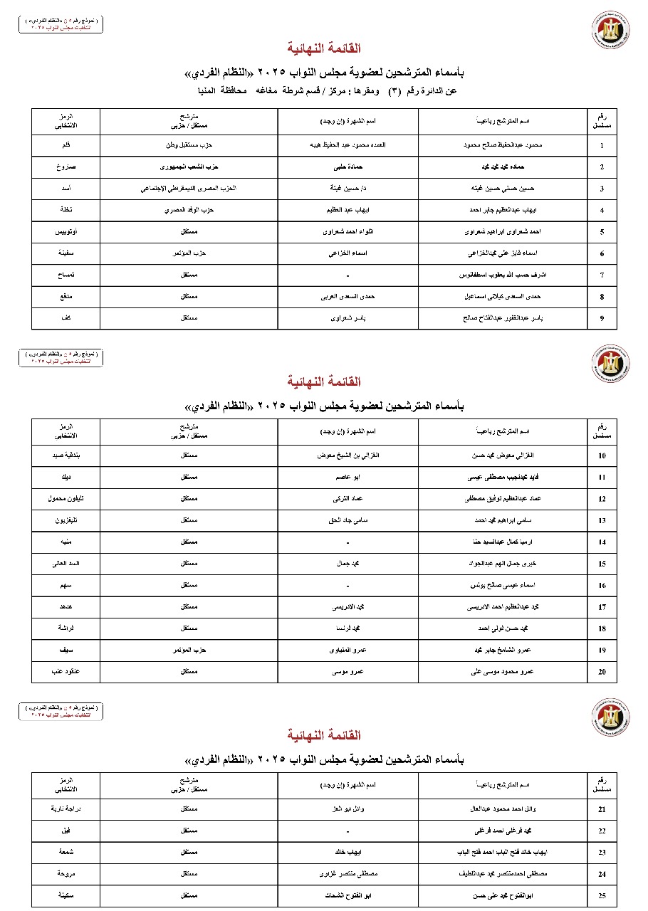 القائمة النهائية لمرشحي دوائر محافظة المنيا عن النظام الفردي