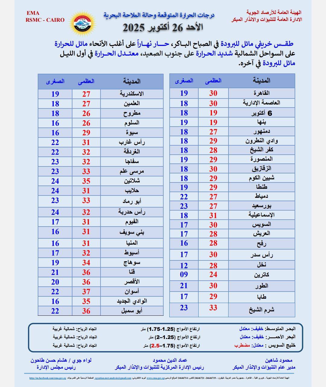 ونرصد فيما يلي بيان درجات الحرارة المتوقعة، غدًا، على محافظات ومدن مصر: