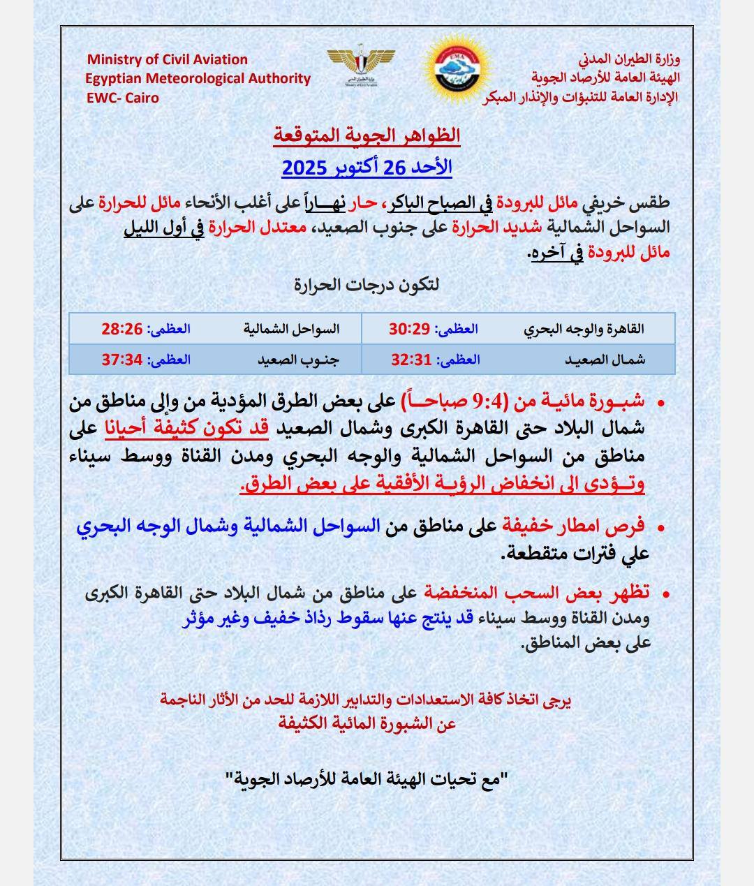 تتكون شبورة مائية صباحًا على بعض المناطق من القاهرة الكبرى وشمال الصعيد، قد تكون كثيفة أحيانًا على مناطق من السواحل الشمالية والوجه البحري ومدن القناة ووسط سيناء، مع فرص أمطار خفيفة على مناطق من السواحل الشمالية وشمال الوجه البحري على فترات متقطعة.
