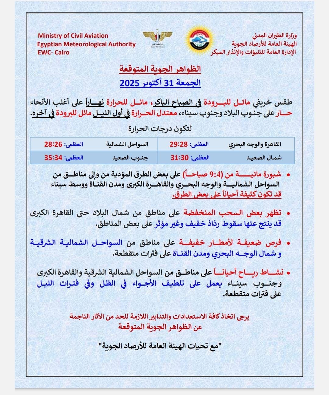 تتوقع الهيئة العامة للأرصاد الجوية، أن يشهد غدا الجمعة 31 أكتوبر، طقس خريفي مائل للبرودة في الصباح الباكر، مائل للحرارة نهاراً على أغلب الأنحاء حار على جنوب البلاد وجنوب سيناء، معتدل الحرارة في أول الليل مائل للبرودة في آخره.