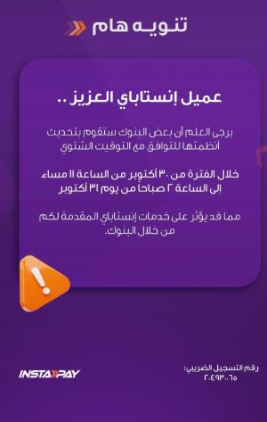 وقال إنستا باي غن بعض البنوك ستقوم بتحديثات في أنظمتها التقنية الليلة للتوافق مع التوقيت الشتوي، خلال الفترة من من الساعة 11 مساء اليوم الخميس، وتستمر حتى الساعة 2 صباحًا من يوم الجمعة 31 أكتوبر 2025.