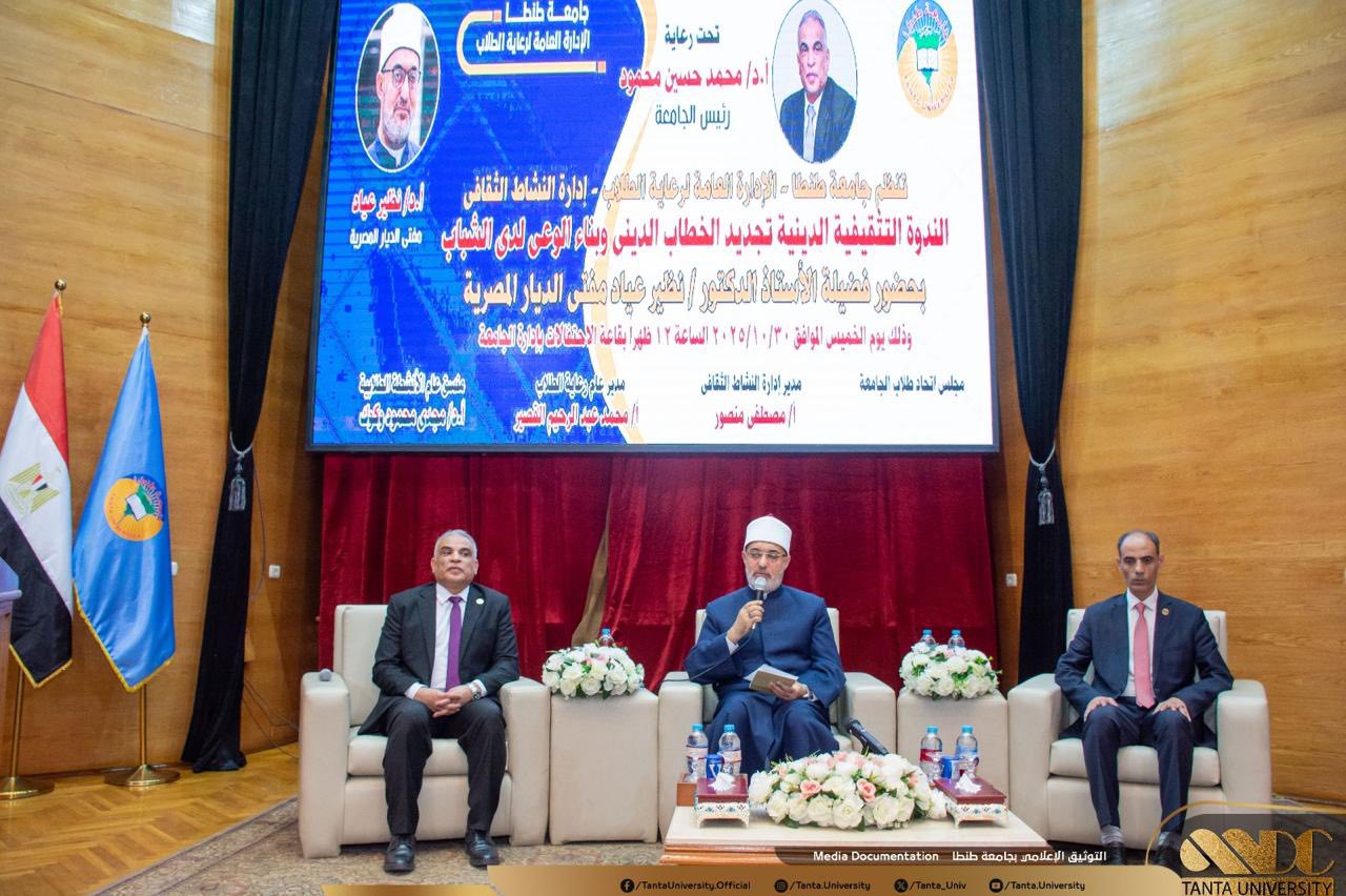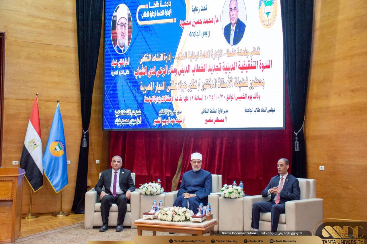 جاء ذلك خلال استضافة جامعة طنطا، اليوم الخميس، فضيلة مفتي الديار المصرية، في ندوة بعنوان "تجديد الخطاب الديني وبناء الوعي لدى الشباب"، حيث كان في استقباله الدكتور محمد حسين رئيس الجامعة، والدكتور محمود سليم نائب رئيس الجامعة لشئون خدمة المجتمع وتنمية البيئة، والدكتور حاتم أمين نائب رئيس الجامعة لشئون الدراسات العليا والبحوث، وبحضور عدد من عمداء ووكلاء الكليات وأعضاء هيئة التدريس والعاملين وذلك بقاعة المؤتمرات بإدارة الجامعة.