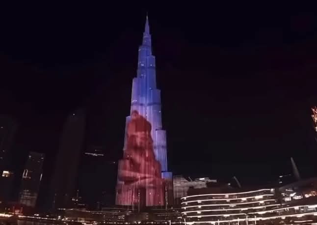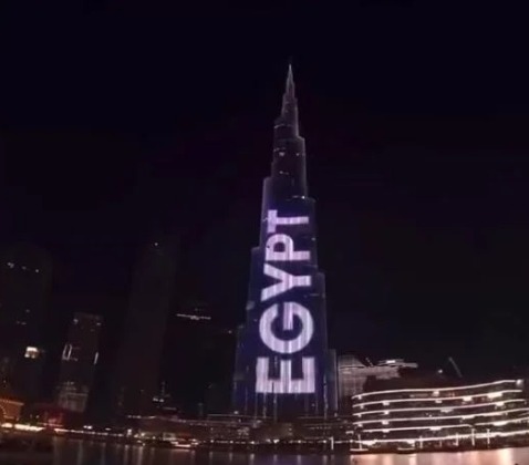 وأضاءت واجهة برج خليفة بألوان الأحمر والأبيض والأسود، بينما تعاقبت عليها صور النقوش والتماثيل الفرعونية الشهيرة، في مشهدٍ جمع بين الفخامة التقنية والرمزية التاريخية، وسط تفاعل واسع من الزوار والسياح الذين احتشدوا لمتابعة العرض المهيب.