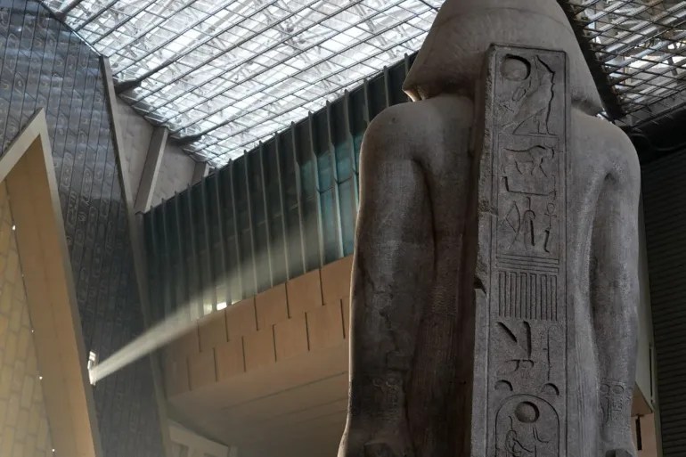 عند مدخل البهو العظيم، يقف تمثال الملك رمسيس الثاني شامخا في مكانه الجديد، كأنه يستقبل ضيوف مصر واحدا تلو الآخر.