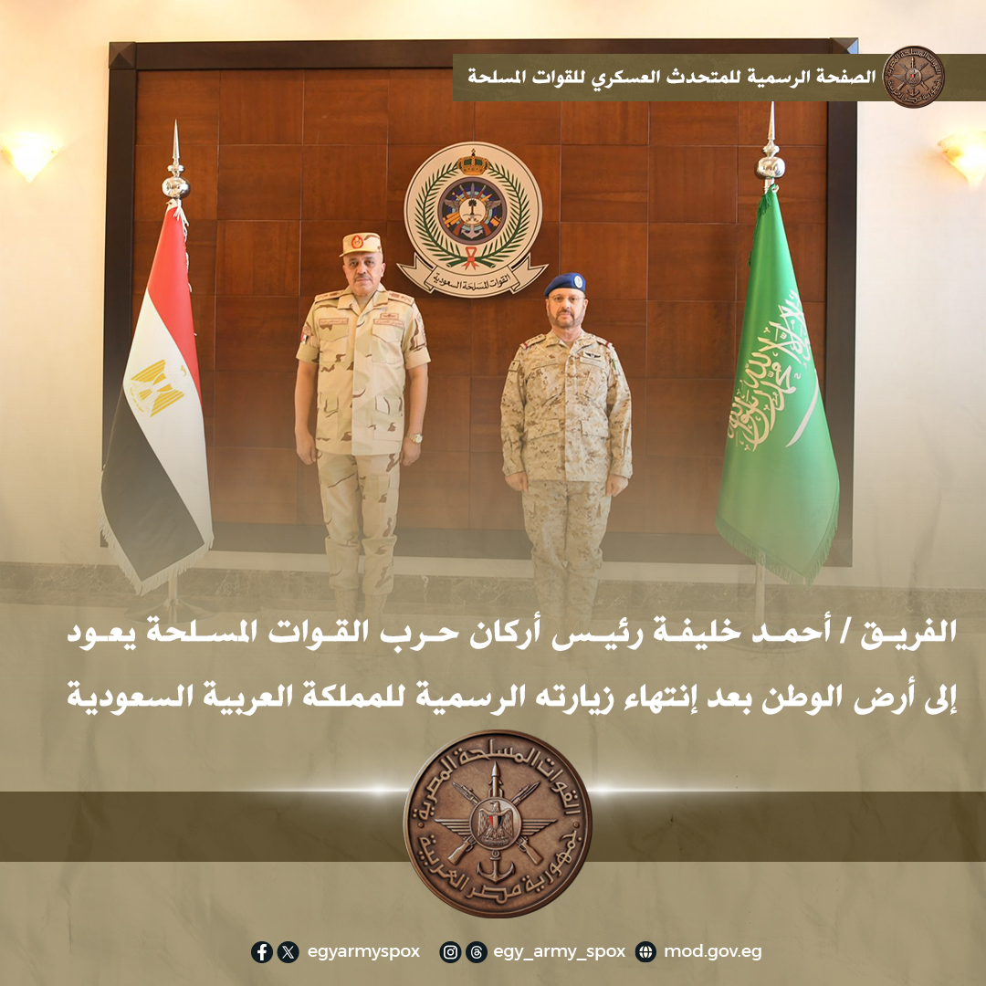 عاد الفريق أحمد خليفة، رئيس أركان حرب القوات المسلحة، والوفد المرافق له، إلى أرض الوطن، بعد انتهاء زيارته الرسمية للمملكة العربية السعودية، حيث أجريت له مراسم استقبال رسمية، واستعراض حرس الشرف، وعزفت الموسيقات العسكرية السلام الوطني لكلا البلدين.