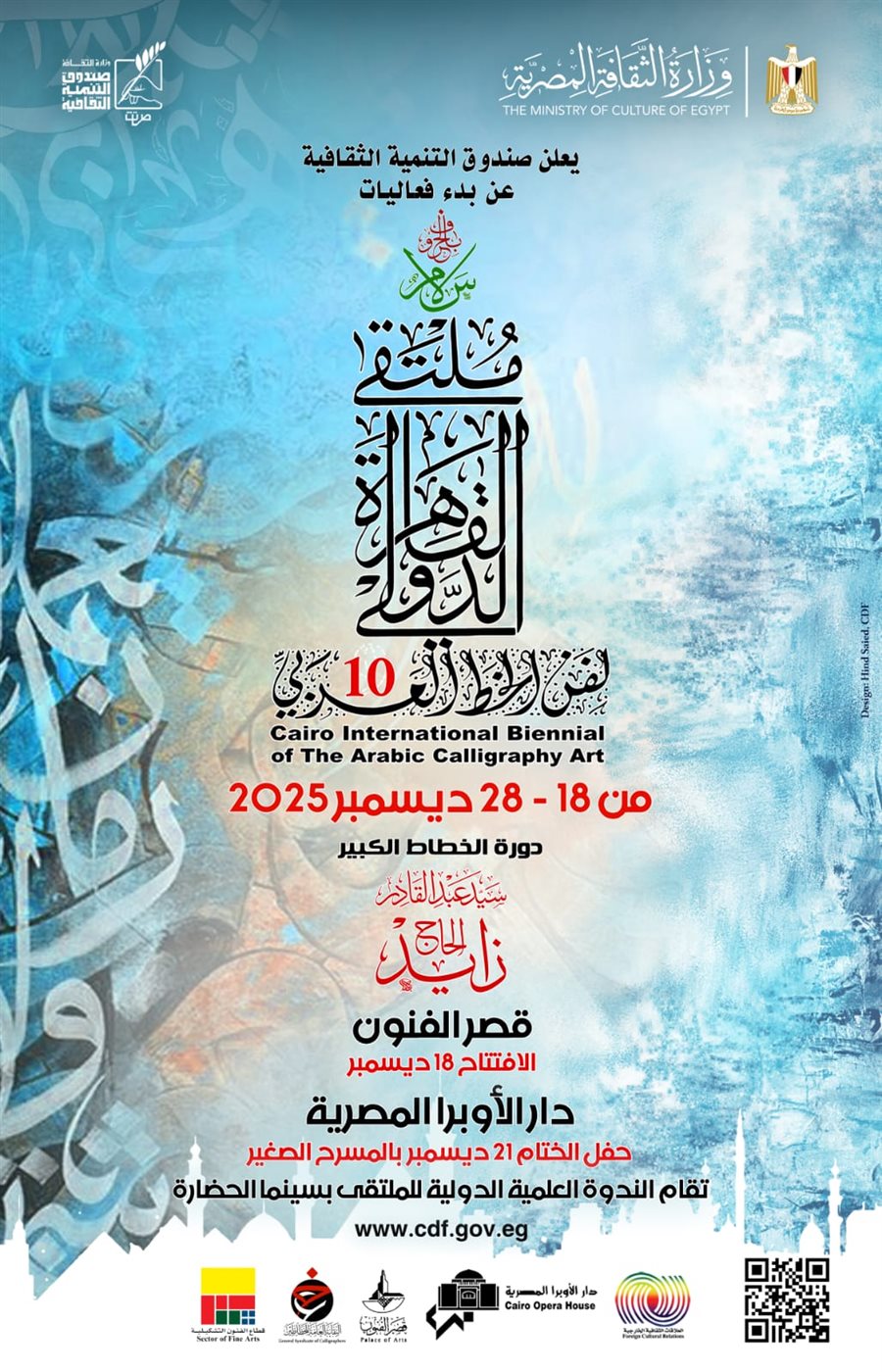 أعلن قطاع صندوق التنمية الثقافية عن انطلاق فعاليات الدورة العاشرة من ملتقى القاهرة الدولي لفن الخط العربي، والتي تقام خلال الفترة من 18 وحتى 28 ديسمبر القادم، بقصر الفنون بساحة الأوبرا، تحت شعار «بالحروف: سلام»، بمشاركة نخبة من كبار الخطاطين والفنانين من مصر وعدد من الدول العربية والأجنبية.