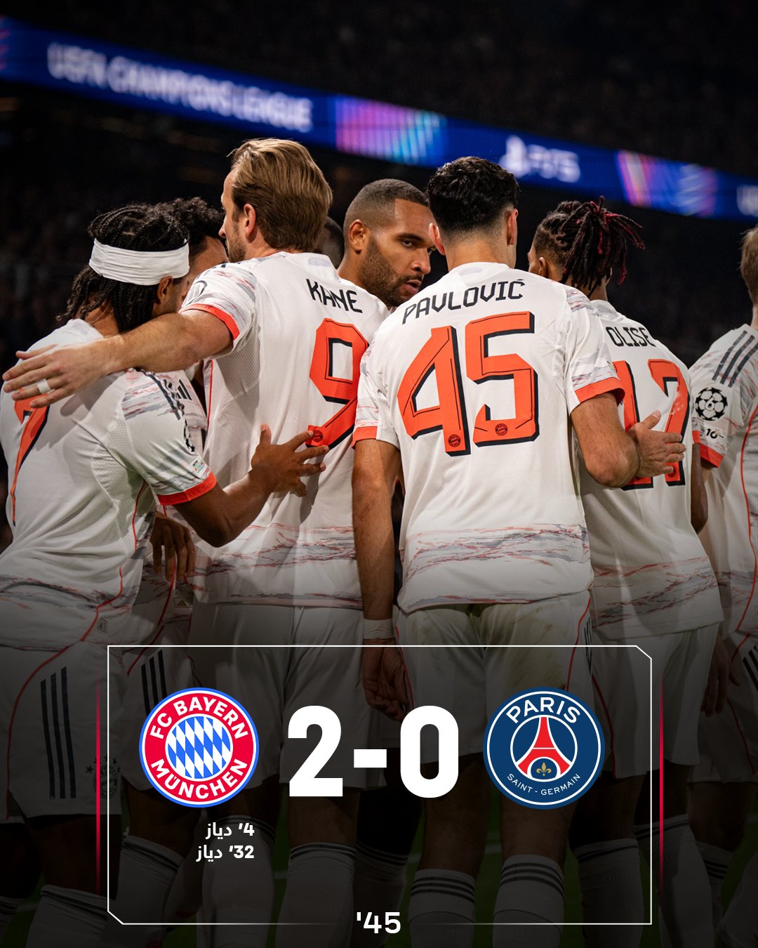 بايرن ميونخ يتقدم على باريس سان جيرمان بثنائية بالشوط الأول في دوري الأبطال