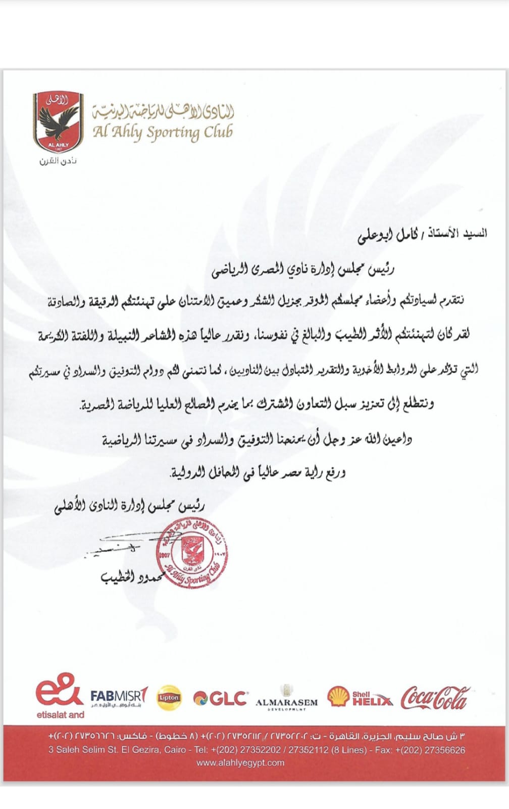 وجه النادي الأهلي خطاب شكر إلى مجلس إدارة النادي المصري البورسعيدي، تقديرًا لتهنئته بمناسبة انتخاب مجلس إدارة جديد للقلعة الحمراء.