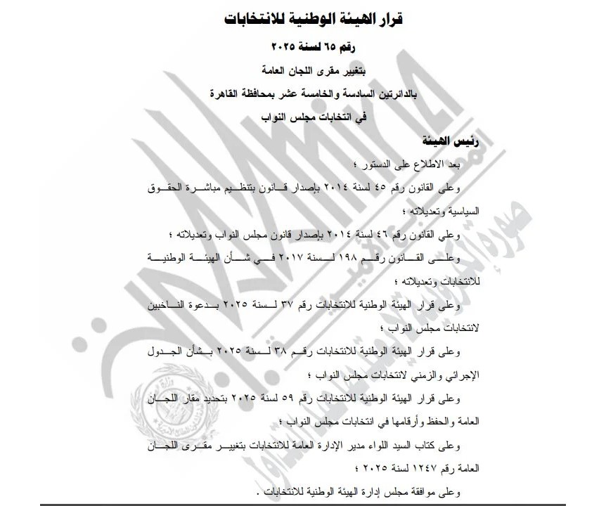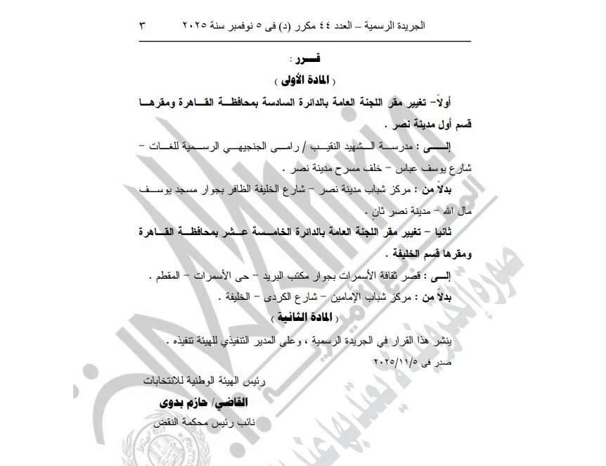 نشرت الجريدة الرسمية قرار الهيئة الوطنية للانتخابات الذى حمل رقم 65 لسنة 2025، بشأن تغيير مقري اللجان العامة بالدائرتين السادسة والخامسة عشر بمحافظة القاهرة في انتخابات مجلس النواب.