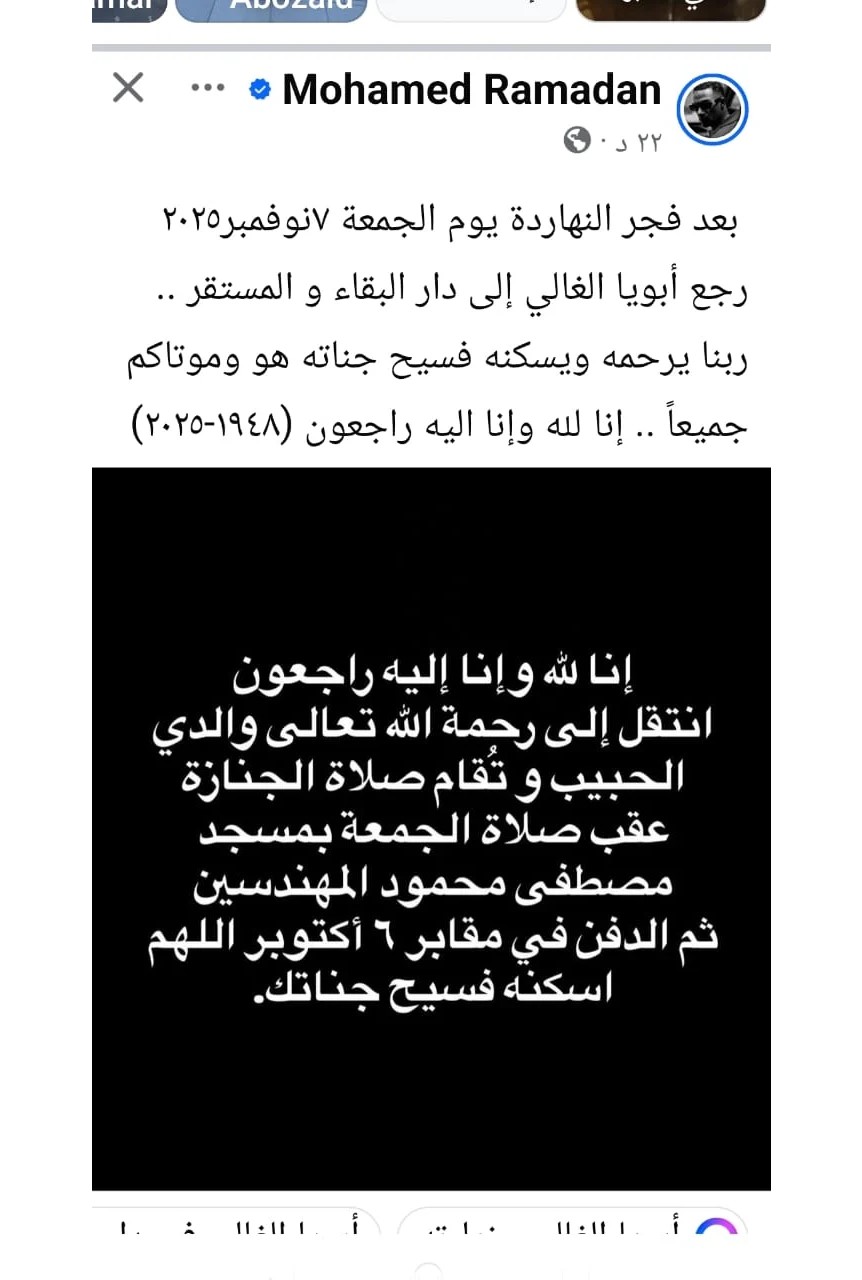 ونعى محمد رمضان والده قائلاً: "بعد فجر النهاردة يوم الجمعة 7 نوفمبر2025، رجع أبويا الغالي إلى دار البقاء والمستقر .. ربنا يرحمه ويسكنه فسيح جناته هو وموتاكم جميعاً .. إنا لله وإنا اليه راجعون 1948-2025".