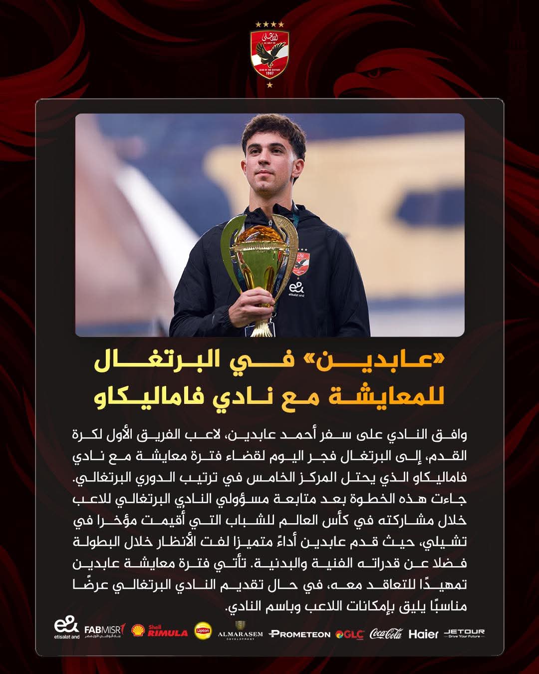 وافق النادي الأهلي على سفر أحمد عابدين، لاعب الفريق الأول لكرة القدم، إلى البرتغال فجر اليوم لقضاء فترة معايشة مع نادي فاماليكاو الذي يحتل المركز الخامس في ترتيب الدوري البرتغالي. جاءت هذه الخطوة بعد متابعة مسؤولي النادي البرتغالي للاعب خلال مشاركته في كأس العالم للشباب التي أُقيمت مؤخرا في تشيلي، حيث قدم عابدين أداءً متميزا لفت الأنظار خلال البطولة فضلا عن قدراته الفنية والبدنية. تأتي فترة معايشة عابدين تمهيدًا للتعاقد معه، في حال تقديم النادي البرتغالي عرضًا مناسبًا يليق بإمكانات اللاعب وباسم النادي.