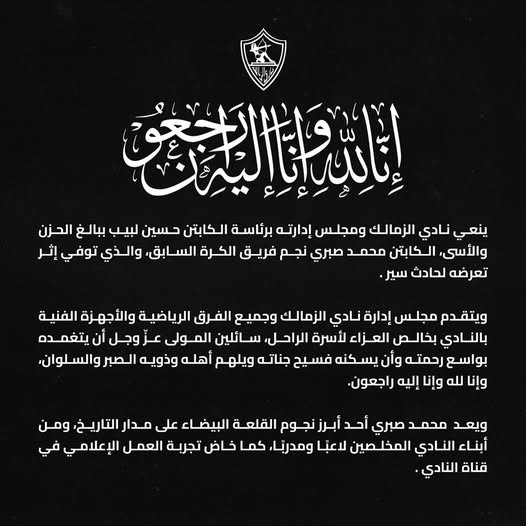 ينعي نادي الزمالك ومجلس إدارته برئاسة حسين لبيب ببالغ الحزن والأسى، محمد صبري نجم فريق الكرة السابق، والذي توفي إثر تعرضه لحادث سير .