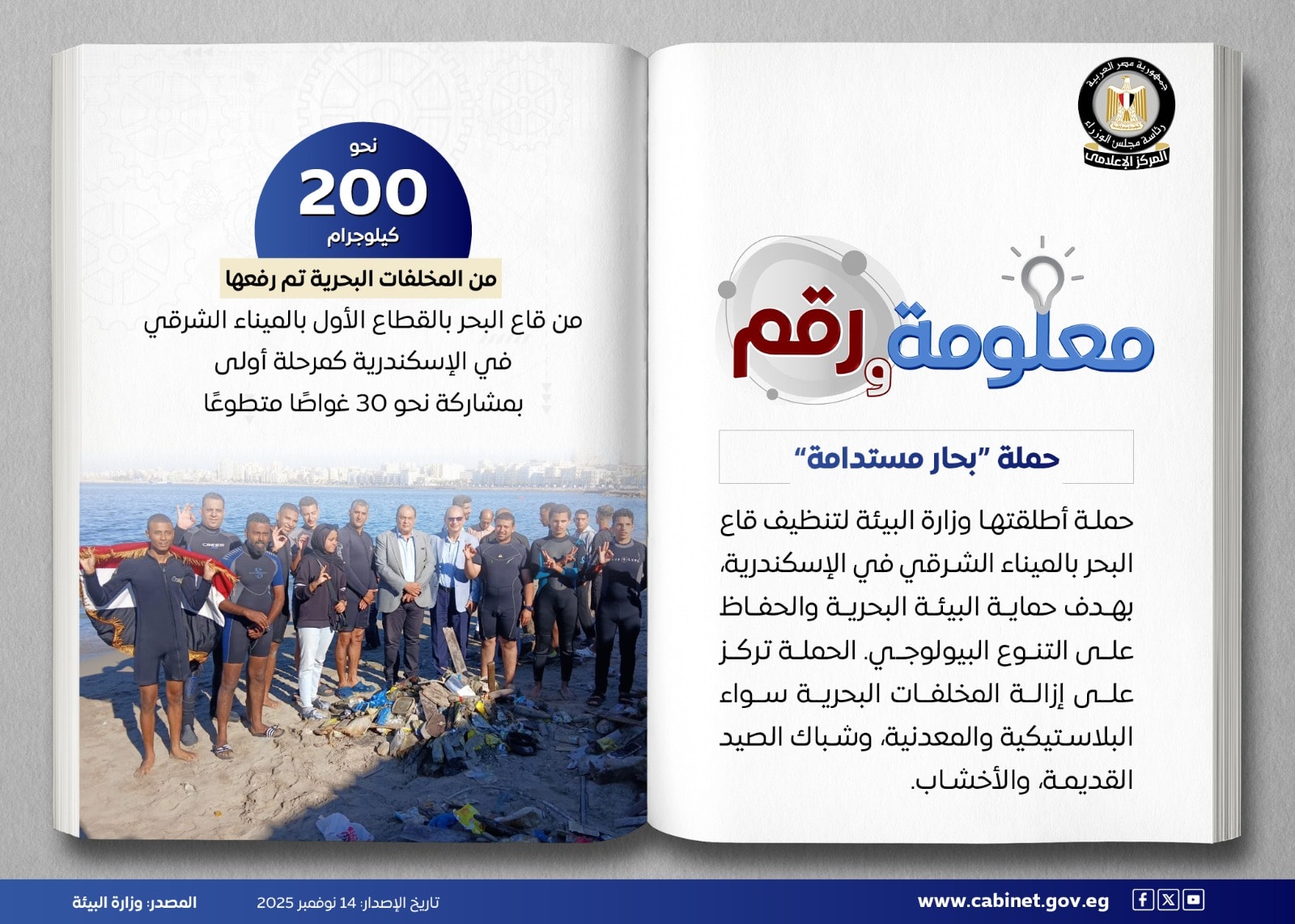 أوضحت رئاسة مجلس الوزراء، وزارة البيئة أطلقت حملة «بحار مستدامة» لتطهير قاع البحر المتوسط بالميناء الشرقي في الإسكندرية، بالتعاون مع المنطقة الروتارية 2451 ومنظمات المجتمع المدني، وبمشاركة نحو 30 غواصًا متطوعًا.