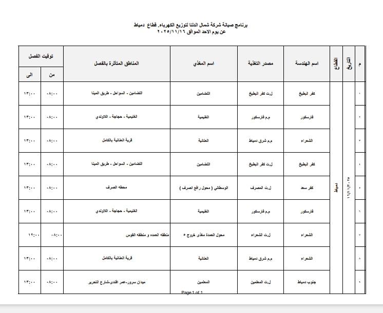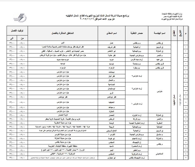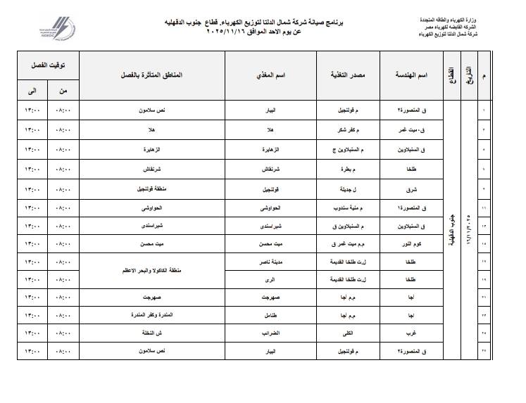 وأعلنت شركة شمال الدلتا عن المغذيات التي سيتم إجراء الصيانة بها، أبو الجدايل، شابه، الخمسين، 18 المنصور، قبريط، الضبعة، أريمون، الحمراوي، عثمان، الترزي، لوحة توزيع ميت علوان" سكان دخول 11-16".