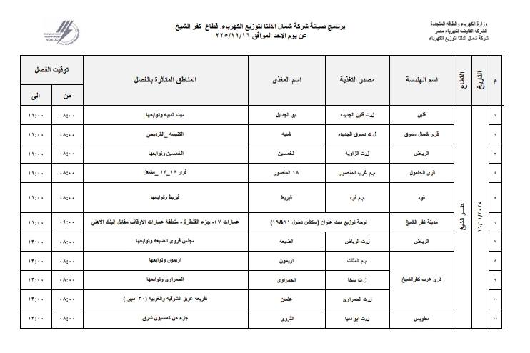 في إطار خطتها الدورية لرفع كفاءة الشبكة وتحسين جودة التغذية الكهربائية والخدمة المقدمة للمواطنين، أعلنت شركة شمال الدلتا لتوزيع الكهرباء، عن انقطاع التيار الكهربائي عن 17 قرية ومنطقة بـ 8 مراكز بمحافظة كفر الشيخ، غداً الأحد، 16 نوفمبر 2025.