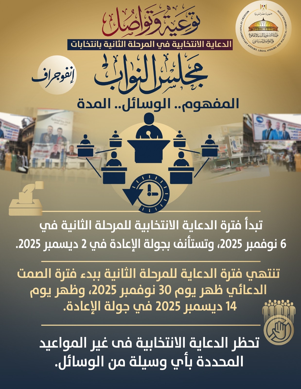 نشرت وزارة الشؤون النيابية والقانونية والتواصل السياسي “إنفوجرافات” توعية عن المرحلة الثانية من انتخابات مجلس النواب 2025، حول الدعاية الانتخابية وأهم المحظورات على المشحين خلال فترة الدعاية الانتخابية.